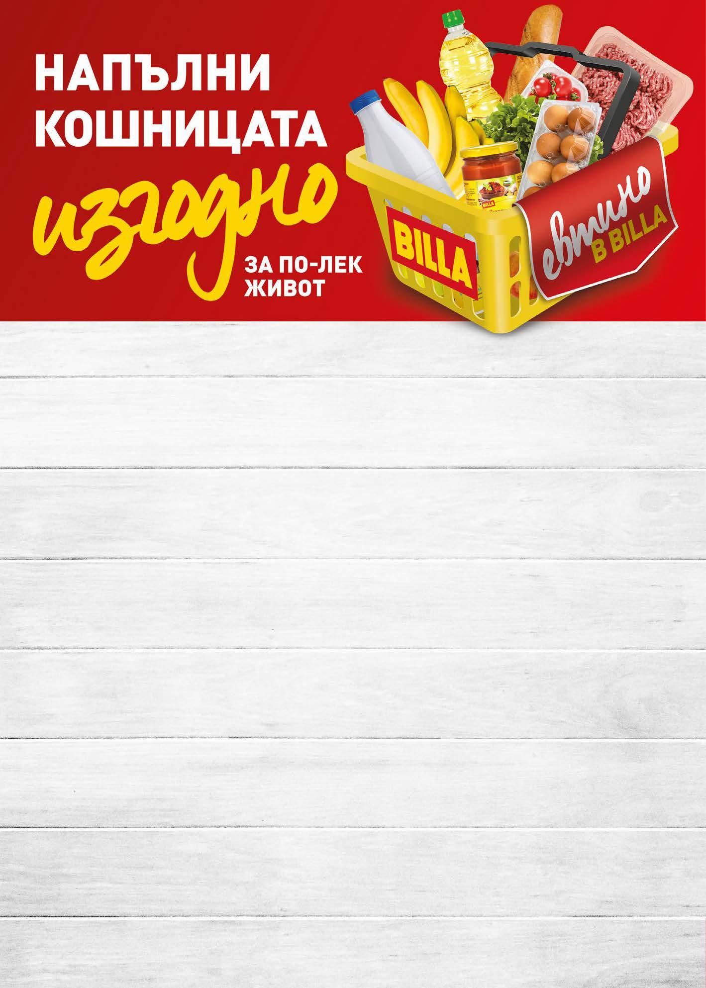 ПН 19.09. 20.09. ВТ 21.09. СРСупер СТАРТ лв.099 -40% млякоКисело2%Елена 400 г предишнацена1,65 лв.099 -33% МакарониGros 400 г предишнацена1,49 лв.349 -36% Мляно кафе Tchibo Family 250 г предишнацена5,49 лв.049 -37% ДебърцинПечен От топлата витрина1бр. предишна цена 0,79 лв.679 -24% маринованижулиени,Пилешкофиле 500 г предишнацена8,99 лв.199 -30% ЗагоркаБира 2 л предишна цена 2,85 лв.099 -28% Кромидлук 1 кг предишнацена1,39 Промоционалните стоки се продават в количества, предназначени за домакинството. Всички оферти са валидни до изчерпване на количествата. BILLA не носи отговорност за допуснати печатни грешки. BILLA си запазва правото да променя цените. Повече на www.billa.bg С този знак се означават продукти, които могат да бъдат закупени еднократно на цена с отстъпка при едновременно маркиране на дигитален ваучер и BILLA Card в приложението BILLA App. Ваучерите са достъпни и на www.billa.bg. Ограничения в закупуваните количества и срок на валидност на офертата се посочват върху ваучера. Отстъпката получаваш веднага на каса. Повече в BILLA App и на www.billa.bg Продуктите, означени в брошурата със символа синя звезда не са налични в магазини BILLA: гр. София, бул. „Цариградско шосе“ №12, ул. „Обиколна“ №32, бул. „Цар Освободител“ №22, ул. „Раковски“ №116, пл. „Лъвов мост“ № 2, ул. „Пиротска“ №9, бул. „Княз Александър Дондуков Корсаков“ №11, ул. „Висарион Белински“ №2Б, ул. „Славянска“ №5, ул. „Пимен Зографски“ №38, ул. „Райко Алексиев“ №40, бул. „Ал.Стамболийски“ №247-В; гр. Пловдив, ул. „Райко Даскалов“ № 8, ул. „Черешово топче“ №2; гр. Бургас, ул. „Александровска“ № 58, ж.к. Изгрев, бл. 178, ул. „Слънце“ №30; гр. Варна, ул. „Димитър Икономов“ №36, ул. „Дубровник“ №46, бул. „Княз Борис I“ №99; гр. Русе, ул. „Неофит Бозвели“ №18, пл. „Свобода“ №7; гр. Стара Загора, ул. „Княз Борис“ №93, бул. „Цар Симеон Велики“ №105 А; гр. Хасково, пл. „Общински“ №3; гр. Шумен, бул. „Славянски“ №30; гр. Плевен, пл. „Свобода“ №25; гр. Благоевград, ул. „Крали Марко“ №1; гр. Кюстендил, ул. „Пауталия“ №10; гр. Велико Търново, ул. „Георги Измирлиев“ №13А; гр. Монтана, ул. „Акад. Иван Дуриданов“ №2. НАЦИОНАЛЕН ТЕЛЕФОН НА КЛИЕНТА 0700 120 10 СВЪРЖИ СЕ С НАС НА ЦЕНАТА НА ЕДИН ГРАДСКИ РАЗГОВОР