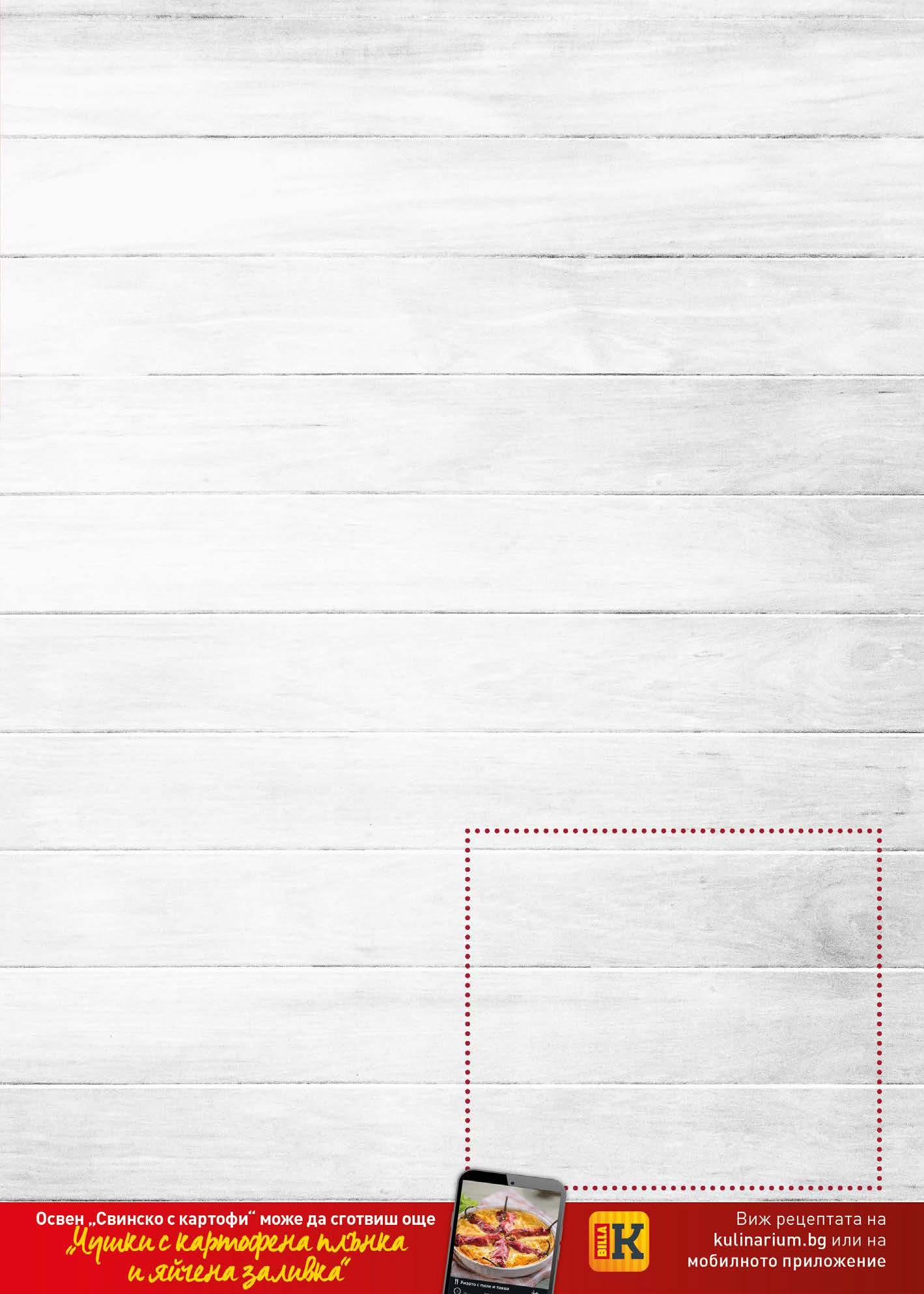 Виж рецептата на kulinarium.bg или на мобилното приложение Освен „Свинско с картофи“ може да сготвиш още„Чушки с картофена плънкаи яйчена заливка“ Прясно млякоOlympus3,7% 1 л предишна цена 3,59 лв.289 -19% В BILLA Яйца НашитеразмерфермиL 10 бр. в опаковка предишна цена 4,99 лв.339 -32% В BILLA КравеДряновосирене За 1 кг предишна цена 9,49 лв.799 -15% В BILLA В BILLA лв.259 -42% БългарскиКръстевориз 1кг предишна цена 4,49 В BILLA БрашноКраго 1 кг предишна цена 1,74 лв.129 -25% лв.199 -39% боб,СвареннахутLuengo 570 г предишна цена 3,29 В BILLA