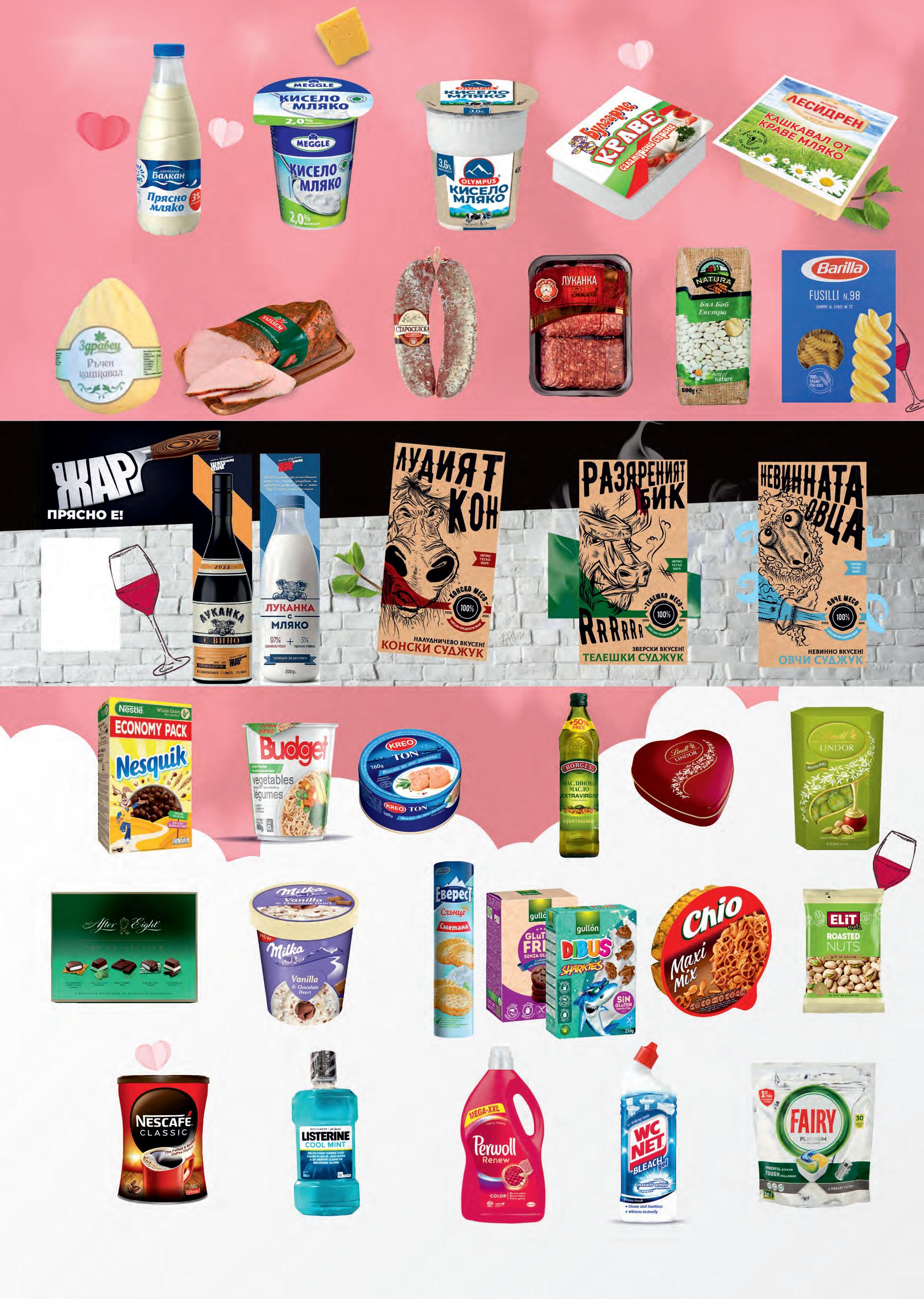 Лудият кон вакуум 150 г 39,93 лв./ кг Суджук 41,93 лв./ кг Суджук 150 г Разяреният бик вакуум Невинната овца вакуум Суджук 150 г 51,93 лв./ кг вакуум 200 г 34,95 лв./ кг Луканка с мляко / вино 7,99 6,бр. 99 7,39 5,бр. 99 7,59 6,бр. 29 8,59 7, бр. 79 Промоционална оферта за периода 09 02 - 15.02.2023 г. или до изчерпване на количествата. Цените важат само за продажби в количества, обичайни за домакинството. ЛАКТИМА Прясно мляко 3 % Балкан 1 л MEGGLE Кисело мляко 2 % 400 г OLYMPUS Кисело мляко 3,6 % 400 г бяло, саламурено 17,48 лв./ кг 400 г БУЛГАРЧЕ Краве сирене вакуум ЛЕСИДРЕН 400 г вакуум Краве кашкавал 24,98 лв./ кг Краве кашкавал вакуум 520 г 22,67 лв./ кг ЗДРАВЕЦ ТАНДЕМ гастро пушена Рибица Староселска подкова / Тетевенски гастро Суджук ЕЛИТ МЕС слайс, вакуум 23,47 лв./ кг ЕЛИТ МЕС Луканка Класик / Кпривщенска 170 г Platinum Таблетки за съдомиялни машини 30 бр. в опаковка FAIRY PERWOLL Препарат за пране различни видове 67 пранета LISTERINE 500 мл Fresh burst / Cool mint Вода за уста Classic 250 г NESCAFE Разтворимо кафе GULLON Gluten free 200 / 250 г различни видове Бисквити NATURA Боб Екстра 500 г BARILLA Макарони различни видове 500 г NESTLE Зърнена закуска 600 / 625 г различни видове пиле / зеленчуци Инстантни спагети 60 г BUDGET филе КREO Риба тон в собствен сос / олио 160 г Екстра върджин 750 мл Маслиново масло BORGES Lindor метално сърце 50 г LINDT Бонбони 29,89 19, кг 99 -33% 13,99 11, бр. 79 5,49 3, бр. 99 39,89 34, кг 89 -27% 3,15 2, бр. 19 -30% 3,49 2, бр. 29 -34% 1,99 1, бр. 59 -20% 1,59 1, бр. 25 -21% 3,99 2, бр. 59 -35% 9,99 6,бр. 99 -30% 12,49 9,бр. 99 -20% НОВО Еверест 150 г различни видове ПОБЕДА Бисквити Слънце 12,99 10,бр. 99 2,49 1, бр. 74 -30% 3,99 2, бр. 59 -35% 14,89 11, бр. 89 -20% 6,99 5,бр. 99 11,49 9, бр. 49 различни видове 200 г Lindor LINDT Шоколадови бонбони NESTLE After Eight The collection Бонбони 199 г 12,79 10, бр. 79 NESTLE 480 мл – 332 г Milka / Oreo / Toblerone различни видове Сладолед 13,99 10, бр. 49 -25% 1,69 1, бр. 39 Шам фъстък печен 70 г ELIT 4,45 2, бр. 59 -41% Крекери CHIO 100 г Maxi mix 3,29 2, бр. 19 -33% 14,39 11, бр. 99 9,65 4, бр. 82 -50% 37,99 19, бр. 99 -47% 16,99 10,опак. 99 -35% 3, бр. 85 4,49 4,45 750 мл WC NET Bleach Препарат различни видове 4,55 2, бр. 99 -34%
