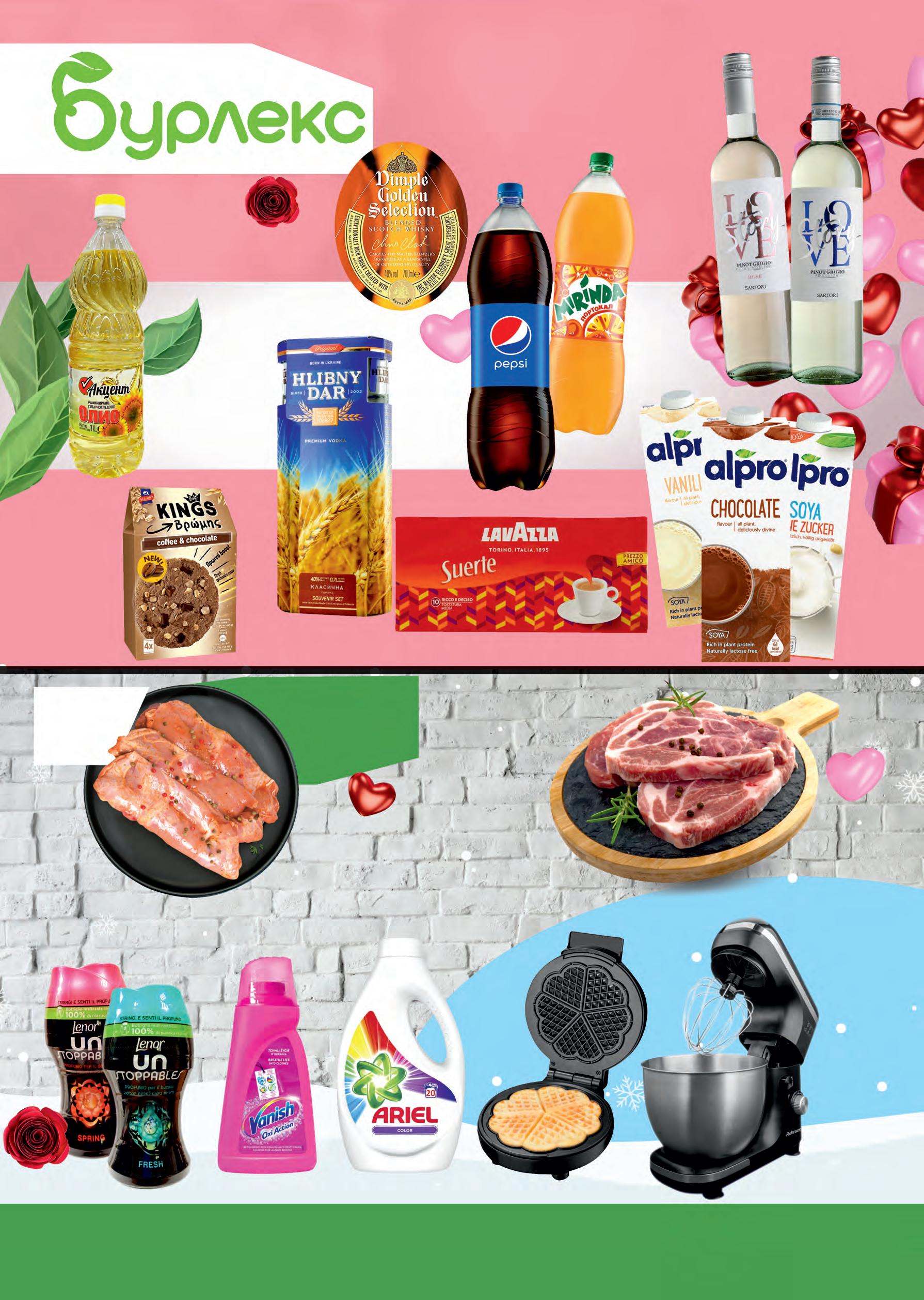 Промоционалната брошура е валидна за супермаркети БУРЛЕКС с адреси в гр. София - бул. Арсеналски 105; ж.к. Изток, ул. Тарас Шевченко 13; кв. Манастирски ливади, ул. Мур 56; ж.к. Борово - ул. Пирински проход 47 и ул. Пчела 30; кв. Враждебна, ул. 27, жк. Надежда 4 - ул. Екзарх Стефан до бл. 462, ж.к. Бояна, ул. Севастократор Калоян 77 и в гр. Елин Пелин, бул. София 17 и ул. Витоша 10, гр. Тутракан, ул. Родина 1, гр. Дългопол, ул. Ген. Заимов 5, гр. Долни Чифлик, ул. Ботевска 16. Всички цени са с включен ДДС. В цените на продуктите не са включени декорациите.