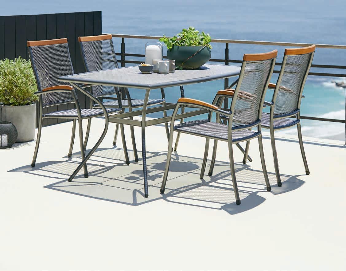 LARVIK ГРАДИНСКИ МЕБЕЛИ Маса: Алуминий и стомана. С предпазващо от ръжда покритие Durasint®. Ш90 x Д150 x В74 см Стол: Стомана и омаслена FSC® твърда дървесина. С предпазващо от ръжда покритие Durasint®. Стифиращ.