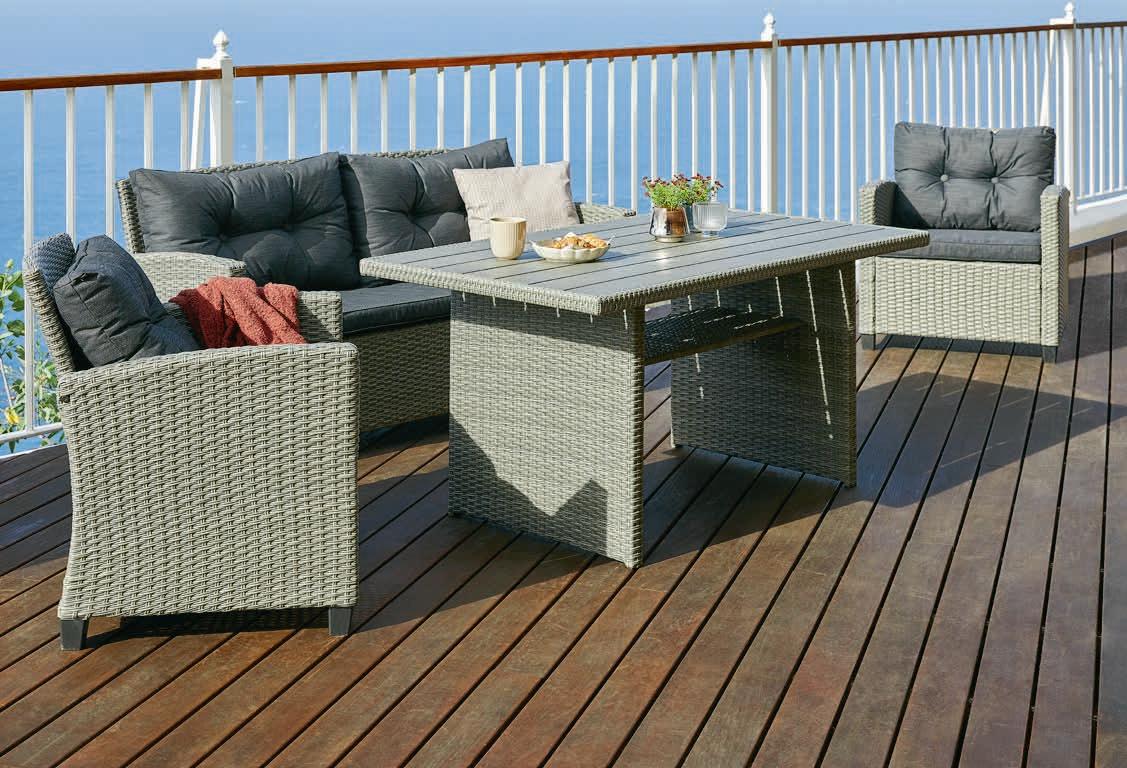 Маса: Алуминий, изкуствена дървесина, ПВЦ ратан и гранит.