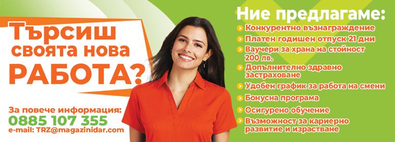 Във всички обекти на ТВ “ДАР” можете да плащате и със следните ваучери и банкови карти: Адреси на обекти на територията на гр. София: Магазин “Дар” кв. “Гоце Делчев”, ул. “Луи Айер” №36, 07:30 - 22:00 ч. Магазин “Дар” ж.к. “Младост” 3 до бл. 353, 07:30 - 22:00 ч. Магазин “Дар” кв. “Хиподрума”, ул. “Видлич” №4, 07:30 - 22:00 ч. Магазин “Дар” ж.к. “Банишора”, ул. “Подп. Калитин” м/у бл. 18 и 19, 07:30 - 22:00 ч. Магазин “Дар” “Руски паметник”, ул. “20-ти април” №32 – 40 (в ремонт) Магазин “Дар” ж.к. “Стрелбище”, блок №4, 07:30 - 22:00 ч. Магазин “Дар” бул. “Христо Ботев” и ул. “Клокотница”, 07:30 - 22:00 ч. Магазин “Дар” ж.к. “Лозенец”, ул. “Милин Камък” №14, 07:00 - 22:00 ч. Магазин “Дар” кв. “Хладилника”, ул. “Козяк” №21А, 07:30 - 22:00 ч. Магазин “Дар” ж.к. “Лозенец”, ул. “Златовръх” №38, 07:30 - 22:00 ч. За контакти: 02 962 58 46, office@magazinidar.com, www.magazinidar.com Посочените артикули се предлагат в следните търговски обекти: Оранжева цена - Всички обекти Зелена цена - Само в “Младост”, “Гоце Делчев”, “Хиподрума”, “Банишора” и Червена“Хладилника”цена - Само в “Младост” и “Гоце Делчев” * - Всички обекти без “Младост”, “Гоце Делчев” ** - Само в “Младост”, “Гоце Делчев”, “Хиподрума”, “Банишора”, “Христо Ботев”, “Хладилника” и “Лозенец - Златовръх” Всички цени са в български лева с вкл. ДДС и важат само за посочения период! ТВ “ДАР” си запазва правото за корекция в цените! Количествата са лимитирани! ТВ “ДАР” не носи отговорност за допуснати печатни грешки! Orange лв|бр 0.99 0.65-34%“Fornetti”ЗакускаПица Green лв|бр 4.19 2.99-29%Свинска пържолаПечена Red лв|бр 11.89 9.99-16%ПеченоПиле Orange лв|бр 0.49 0.35-29%Мини багета Със семена110г Red лв|бр 2.99 1.79-40%Бекон Green лв|бр 1.39 0.99-29%ПеченаНаденица85г Green лв|кг 21.99 16.99-23%Филе отНаскумрияскара лв|кг 0.99 Патладжанилв|кг 2.79Червени“Капия”чушки Orange лв|кг 1.99 Круши Orange лв|кг 1.99 Червени домати Orange лв|кг 2.49 Черно грозде Orange лв|бр 1.99Малини125г Произход България Произход България