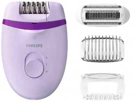 Нежни епилиращи дискове. 2 настройки за скорост. Миеща се епилираща глава. Бръснеща глава с гребен. Капаче за масажиране. Четка за почистване. Калъф за съхранение. Вградена светлина. Кабелна работа.