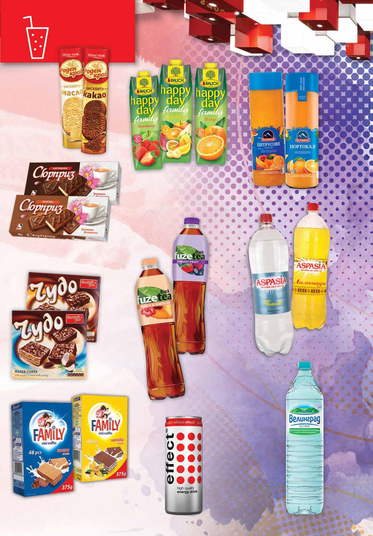 1.89 -31% 1 29 лв|бр 3.99 -25% 2 99 лв|бр 2.89 -31% 1 99 лв|бр 3.19 -31% 2 19 лв|бр 0.99 -30% 0 69 лв|бр 1.49 -33% 0 99 лв|бр 2.99 -26% 2 19 лв|бр 5.49 -27% 3 99 лв|бр 1.79 -50% 0 89 лв|бр 3.19 -34% 2 09 лв|бр Вафлена торта ЧУДО различни видове 180-200 г Тунквани бисквити СЮРПРИЗ различни видове 160 г Бисквити РОДЕН КРАЙ различни видове 165-170г Вафли FAMILY Мини различни видове 375 г Газирана напитка ASPASIA различни видове 2 л Минерална вода ВЕЛИНГРАД PET, 1,5 л Студен чай FUZETEA различни видове 1,5 л Сок OLYMPUS различни видове 1 л Енергийна напитка EFFECT кен, 250 мл Плодова напитка мултивитамин; ягода/ Нектар портокал RAUCH Happy Day Family 1л 15ТВ „Фантастико” не носи отговорност за допуснати печатни грешки. Количествата са лимитирани! Предложенията са валидни до сряда 22.00ч. на 05.10.2022 г.