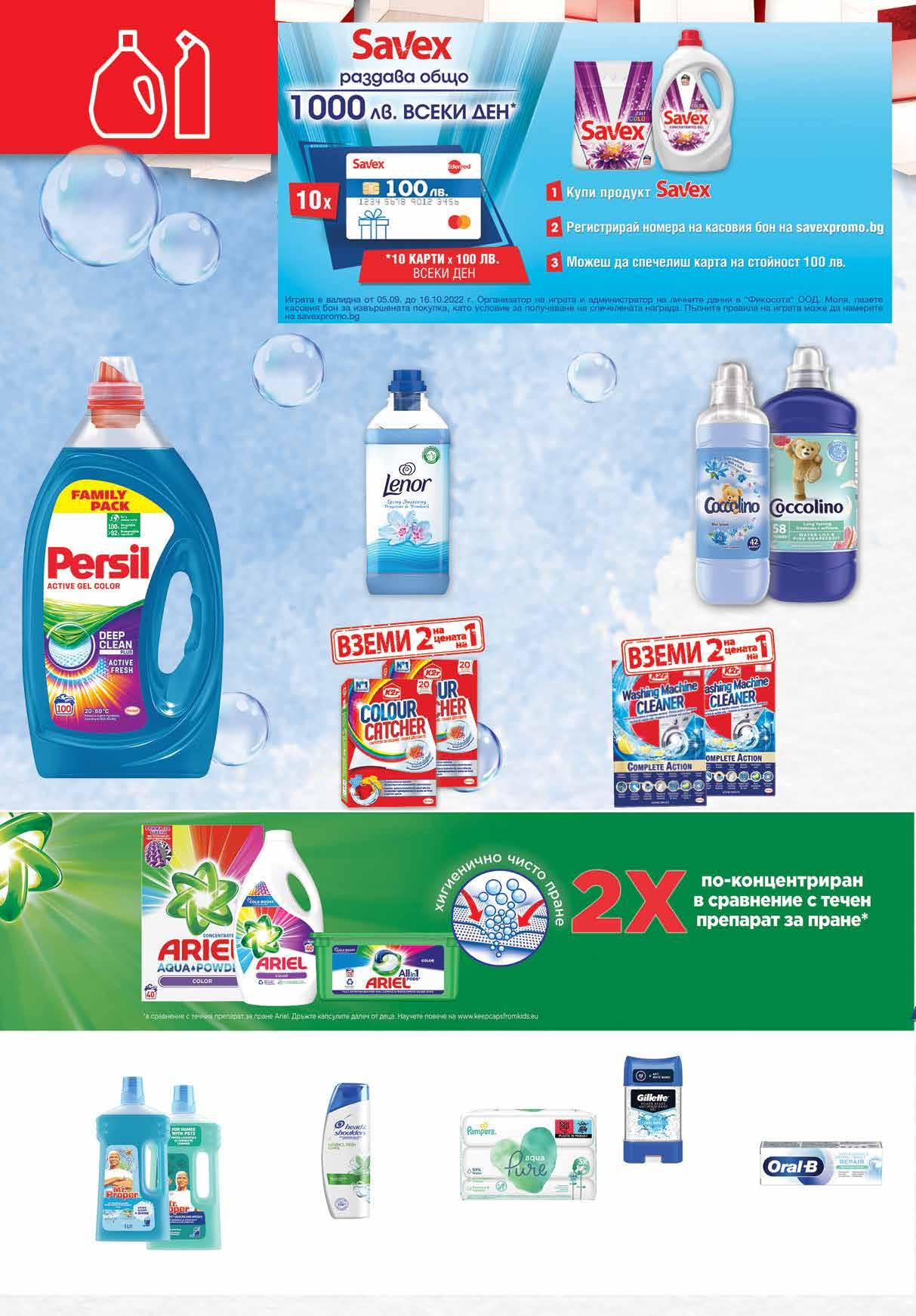 7.99 -40% 4 79 лв|бр 4 89 лв|бр 4 99 лв|бр 99 лв|бр 39.99 -32% 26 49 лв|бр 16.99 -38% 10 6.49 -30% 4 49 лв|бр за под 8.69 -33% 5 79 лв|бр 99 лв|k-t 15.99 -31 % 10 49 лв|бр16 49 лв|бр капсули16 5 19 лв|бр 10.99 -42% 6 29 лв|бр 13.96 -50% 6 98 лв|2 оп. 13.96 -50% 6 98 лв|2 оп. 5 99 лв|бр 1.45л Препарат Mr.PROPER за дървени повърхности; за домове с домашни любимци; за деликатни повърхности 1 л Oмекотител COCCOLINO различни видове 925 мл-1.05 л; 1.45 л Гел 2,2 л; Прах 4 кг; Капсули 28 бр за пране SAVEX различни видове Комплект бебешки кърпички PAMPERS Pure Aqua 3 оп. х 48 бр; Coconut 3 оп. х 42 бр Омекотител LENOR различни видове 1.7 л Гел за пране PERSIL Color; Regular; Sensitive 100 пранета, 5 л Препарат за под Mr.PROPER лавандула; лимон; океан; цветя 1 л Паста за зъби ORAL B Repair Effect; Repair Gentle; Original 75 мл Шампоан HEAD& SHOULDERS различни видове 225 мл Гел 1,65; 1,98; 2,2 л; Прах 2,6 кг; Капсули 22; 28 бр за пране ARIEL различни видове Део гел GILLETTE различни видове 70-75 мл Цветоулавящи кърпи за цветно пране COLOUR CATCHER 2 опаковки х 20 бр Препарат за почистване на пералня K2R 2 опаковки х 2 бр * предложението е валидно от 29.09. до 05.10.2022г. 22 Продуктите се продават в количества, обичайни за едно домакинство. Декорацията към продуктите не е включена в тяхната цена. ТВ „Фантастико“ си запазва правото на промяна в цените.