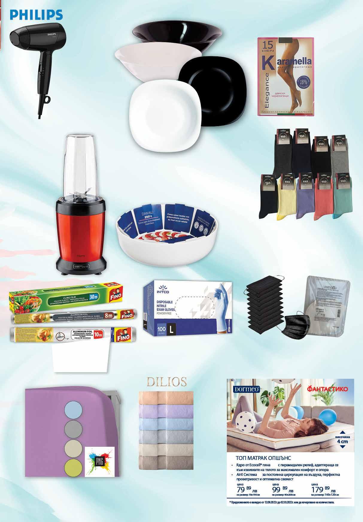1 99 лв|бр 4.29 -23% 3 29 лв|бр 3.99 -20% 3 19 лв|бр 1.19 -20% 0 95 лв|бр KN95 79 лв|бр купа10 99 лв|бр11 99 лв|бр 29.99 -20% 23 49 лв|бр 29.49 -30% 20 99 лв|бр99 3 09 лв|бр десетрна 3 45 лв|бр основна;супена бяла 3 29 лв|бр основна;супена черна 6 29 лв|бр 50/90 2 15 лв|бр 30/50 99 лв|бр 70/14013 4 29 лв|бр алум. 8м 2 25 лв|бр опаковачно 2 99 лв|бр алум.10м 79 лв|бр 180/200 30.99 -20% 24 99 лв|бр 164/200 28.99 -20% 22 99 лв|бр 90/200 21.49 -20% 16 Чорапи VAS Kласик дамски дюс №36-39; мъжки класик № 42-46 Чорапoгащник КАРАМЕЛА с ликра 15 DEN Чаршафи ранфорс с ластик PNG 90/200 см; 164/200 см; 180/200 см; различни цветове Маска за лице еднократна черна 3-слойна 10 бр; Маска за лице KN95 5-слойна 1 бр; ЕТРОПАЛ Ръкавици нитрилни INTCO размер M; L; XL 100 бр в кутия Тава LUMINARC Diwali Ø30 см Алуминиево фолио Опаковъчно фолио различни размери FINO Купа 27 см LUMINARC Carine бяла/черна; Чиния LUMINARC Carine основна 26 см; супена 21 см; десертна 19 см бяла/черна Сешоар PHILIPS ВНС010/10 • мощност 1200 W • степени 3 • степени на загряване 2 • сгъваема дръжка Нутриблендер HOMA • 6 ножа за изключително фино пасиране • 800 мл купа за блендера 1бр. •1000 мл купа за блендера 1бр. • Капак за сигурно затваряне на чашата 1бр. • 1200W, 220-240V/ 50-60 Hz Кърпа София DILIOS едноцветена 30/50 см; 50/90 см 70/140 см; различни цветове 21ТВ „Фантастико” не носи отговорност за допуснати печатни грешки. Количествата са лимитирани! Предложенията са валидни до сряда 22.00ч. на 05.10.2022 г.