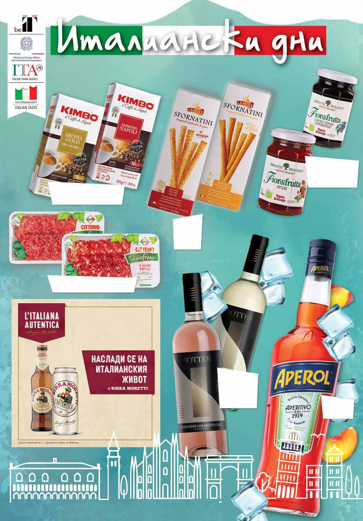2.49 -28% 1 79 лв|бр 11.59 -36% 7 39 лв|бр 99 лв|бр 23.99 -25% 17 6.49 -23% 4 99 лв|бр 4.69 -23% 3 59 лв|бр 1.99 -25% 1 49 лв|бр 330 мл 1.79 -27% 1 29 лв|бр КЕН 11.99 -29% 8 49 лв|бр Аперитив APEROL 700 мл Вино Розе; Пино Гриджо BOTTER произход Италия 750 мл Салам Милано; Наполи CITTERIO слайс, 70 г Мляно кафе KIMBO Aroma Gold; Espresso Napoli вакуум, 250 г Бира MORETTI бутилка 330 мл; кен 500 мл Гризини LA MOLE различни видове 120 г Био конфитюри FIOR DI FRUTTA различни видове 250 г 2 Продуктите се продават в количества, обичайни за едно домакинство. Декорацията към продуктите не е включена в тяхната цена. ТВ „Фантастико“ си запазва правото на промяна в цените.