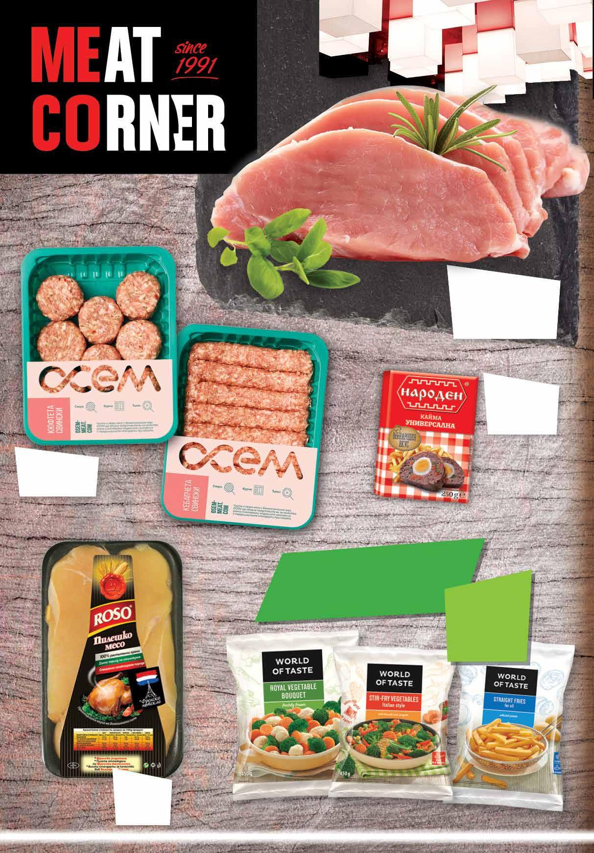 6.49 -27% 4 69 лв|бр 99 лв|кг 19.99 -20% 15 2.49 -33% 1 65 лв|бр 9 49 лв|кг *предложението е валидно за магазините със сини цени Замразени зеленчуци и картофи с марка WORLD OF TASTE с ОТСТЪПКА -30% Пилешко месо ROSO охладено, тарелка ПИЛКО Кайма НАРОДЕН охладена различни видове 250 г Кюфтета/ кебапчета свински ОСЕМ тарелка, 480 г Свинско контрафиле охладено, насипно от щандова витрина* *Цената не важи за предварително опаковано месо 6 Продуктите се продават в количества, обичайни за едно домакинство. Декорацията към продуктите не е включена в тяхната цена. ТВ „Фантастико“ си запазва правото на промяна в цените.