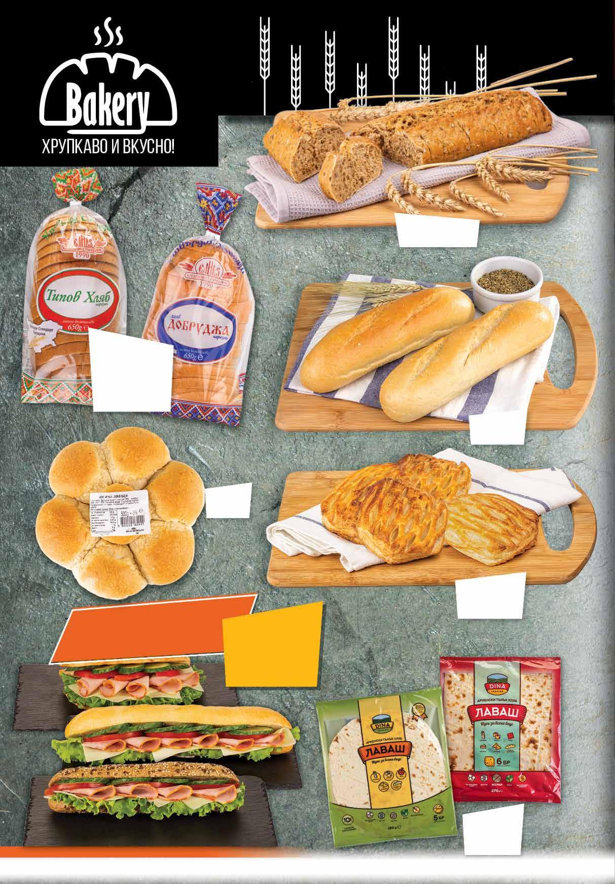2.39 -33% 1 59 лв|бр 2.19 -27% 1 59 лв|бр 2.79 -21% 2 19 лв|бр 1.99 -25% 1 49 лв|бр 0.89 -26% 0 65 лв|бр 0.40 -25% 0 30 лв|брБяла мини франзела 100 г Погача Звезда 500 г Закуска макси с шунка ФОРНЕТТИ 100 г Хляб селски с ръжени кълнове 300 г Нарязан хляб ЕЛИАЗ Tипов; Добруджа Утвърден стандарт България 650 г Хляб ЛАВАШ 6 бр, 270 г; 5 бр, 250 г*предложението е валидно за магазините със сини цени Вземи сандвич със свинско филе с отстъпка -20% 10 Продуктите се продават в количества, обичайни за едно домакинство. Декорацията към продуктите не е включена в тяхната цена. ТВ „Фантастико“ си запазва правото на промяна в цените.