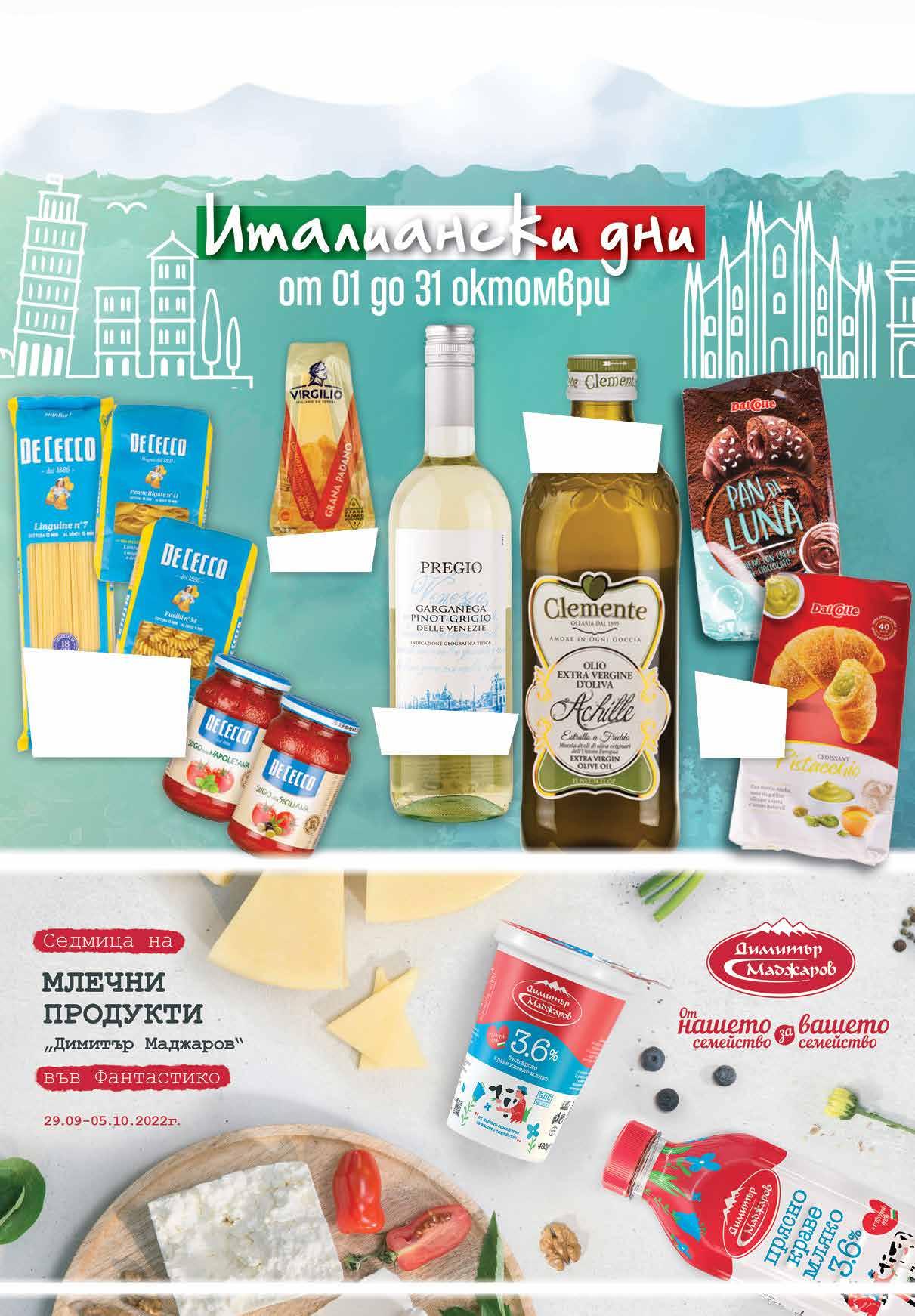 8.29 -22% 6 39 лв|бр 11.49 -21% 8 99 лв|бр 99 лв|бр 18.99 -36% 11 4.89 -22% 3 79 лв|бр 4.99 -20% 3 99 лв|бр 225г 5.99 -33% 3 99 лв|бр 250г Бяло вино PREGIO произход Италия 750 мл Маслиново масло Екстра Върджин CLEMENTE 1 л Кроасани DAL COLLE различни видoве 225 г; 250 г Грана Падано VIRGILIO 150 г Спагети лингуини N7/ N11, 500 г; Макарони фусили/ пенне ригате 500 г; Сос арабиата/ сицилиана/ неаполитана 400 г DE CECCO fantastico.stores www.fantastico.bgОФЕРТА ЗА ПЕРИОДА от 29 .09.2022 г. до 22.00 ч . на 05.10.2022 г.