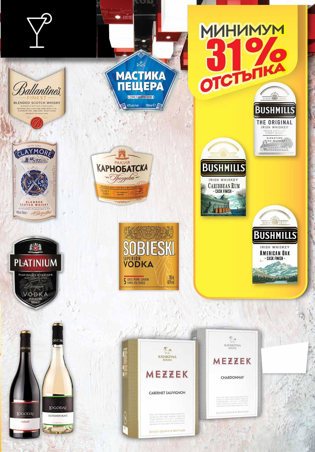11.29 -30% 7 89 лв|бр 99 лв|бр 15.99 -25% 11 99 лв|бр 26.99 -33% 17 99 лв|бр каберне 31.99 -37% 19 99 лв|бр шардоне 31.99 -37% 19 12.79 -29% 8 99 лв|бр 10.49 -23% 7 99 лв|бр 12.49 -28% 8 99 лв|бр 99 лв|бр 23.99 -50% 11 Вино LOGODAJ Selection различни видове 750 мл Мастика ПЕЩЕРА 700 мл Шотландско уиски CLAYMORE 700 мл Шотландско уиски BALLANTINE‘S 700 мл Вино Мezzek KATARZYNA bag-in-box, различни видове 3 л Ракия КАРНОБАТСКА ГРОЗДОВА 700 мл Водка SOBIESKI Superior 700 мл Водка PLATINIUM 700 мл *Ирландско уиски BUSHMILLS Cask finish American Oak 700 мл *Ирландско уиски BUSHMILLS Cask finish Caribbean Rum 700 мл Ирландско уиски BUSHMILLS Original 700 мл *акцията е валидна за магазините със сини цени 17ТВ „Фантастико” не носи отговорност за допуснати печатни грешки. Количествата са лимитирани! Предложенията са валидни до сряда 22.00ч. на 05.10.2022 г.