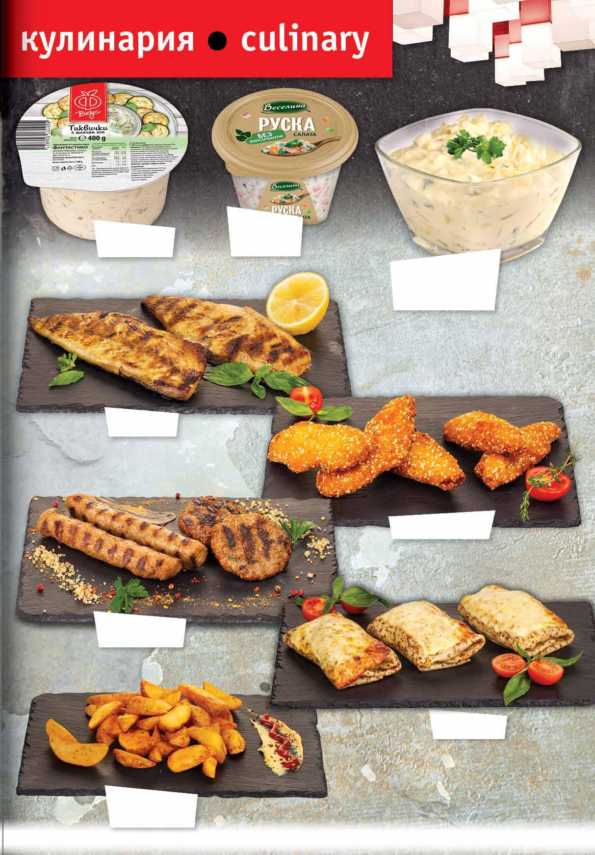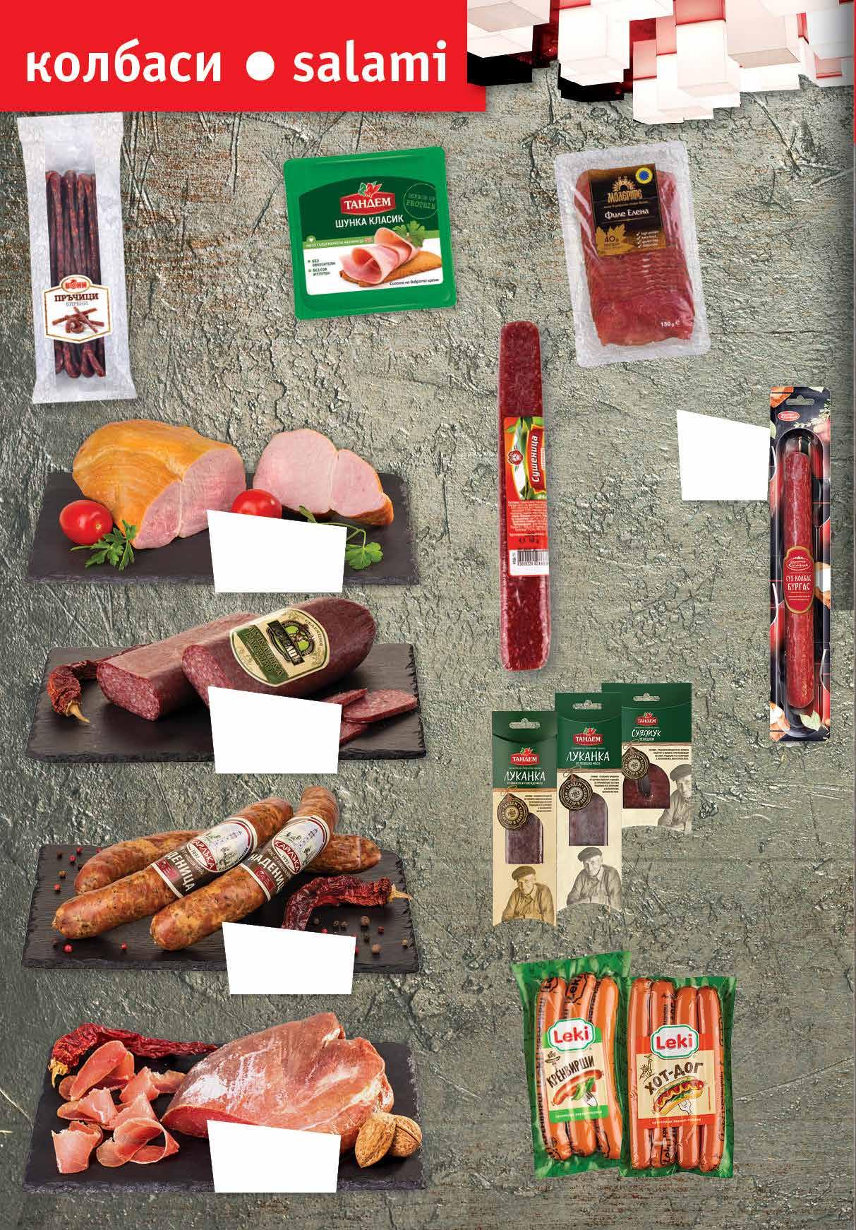 8.79 -23% 6 69 лв|бр 7.99 -25% 5 99 лв|бр 10.99 -27% 7 99 лв|бр 10.99 -27% 7 99 лв|бр тел. луканка 49 лв|кг 13.99 -25% 10 99 лв|кг 29.99 -46% 15 99 лв|кг 36.99 -37% 22 7.59 -23% 5 79 лв|бр 4.49 -33% 2 99 лв|бр хот-дог 4.49 -33% 2 99 лв|бр 12.99 -30% 8 99 лв|кг 3.69 -21% 2 89 лв|бр 6.49 -23% 4 99 лв|бр Сушеница ЦАРЕВЕЦ вакуум, 140 г ЕЛИТ МЕС Шунка ТАНДЕМ Класик слайс, 220 г Луканка ПЕРЕЛИК Гастро, насипна от щандова витрина БЕЛЛА Свинска пастърма ЕЛИТ МЕС насипна от щандова витрина Наденица Кайлъка насипна от щандова витрина ПЛЕВЕН МЕС Кренвирши ЛЕКИ класик 300 г; хот-дог 320 г вакуум Филе Елена МОЛЕРИТЕ слайс, 150 г Сух колбас Бургас МАДЖАРОВ вакуум, 260 г Пръчици бирени БОНИ опаковка, 280 г МК ЛОВЕЧ Луканка от свинско и говеждо месо 170 г; Телешки суджук 160 г; Телешка луканка 160 г Майстор в занаята ТАНДЕМ вакуум Свински бут варено-пушен насипен от щандова витрина ДЕЛИКАТЕС ЖИТНИЦА 8 Продуктите се продават в количества, обичайни за едно домакинство. Декорацията към продуктите не е включена в тяхната цена. ТВ „Фантастико“ си запазва правото на промяна в цените.