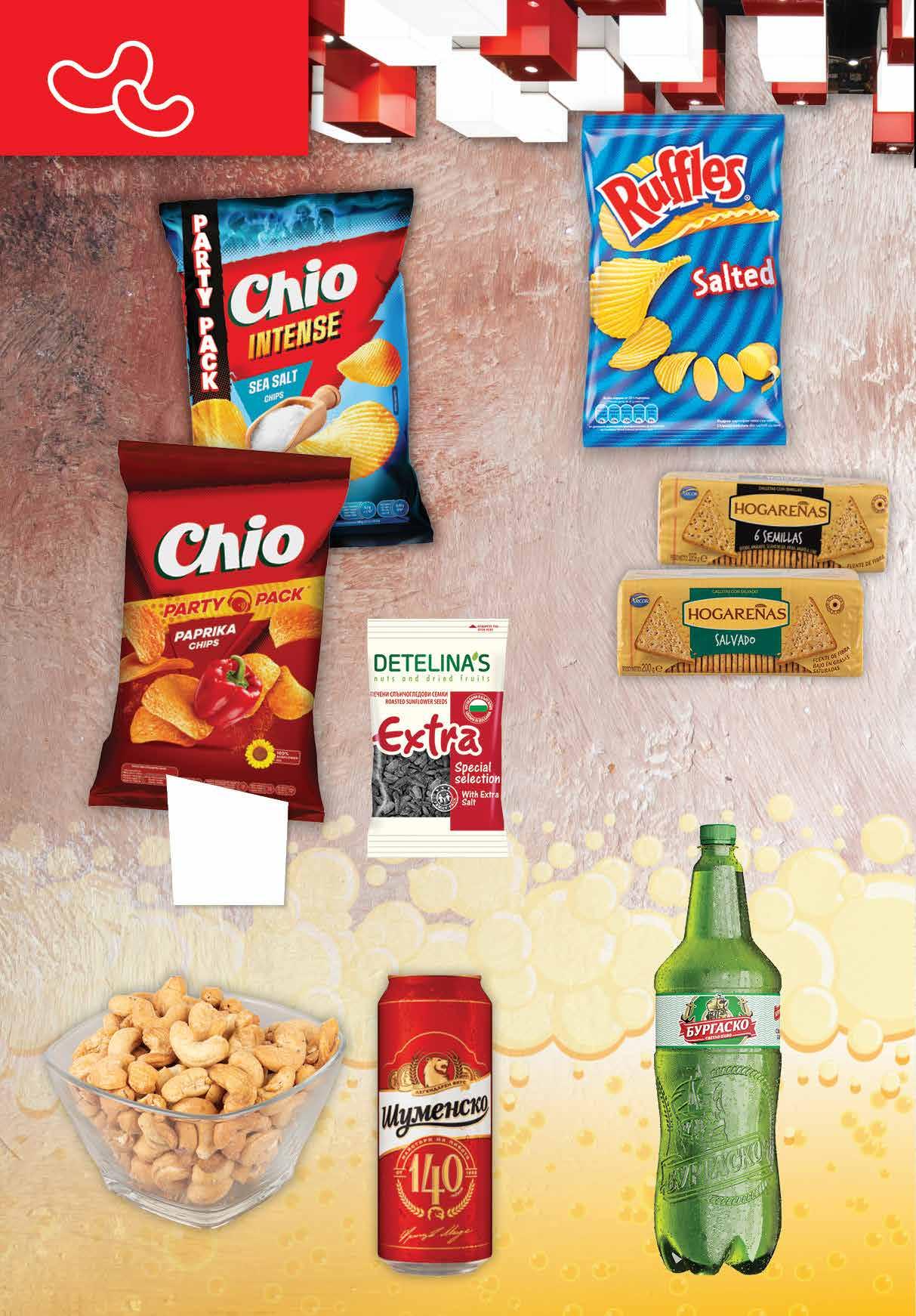 3.79 -39% 2 29 лв|бр 4.99 -34% 3 29 лв|бр 4.99 -34% 3 29 лв|бр intense 2.99 -33% 1 99 лв|бр 1.45 -31% 0 99 лв|бр 2.29 -26% 1 69 лв|бр 1.99 -32% 1 35 лв|бр 99 лв|кг 29.99 -23% 22 Бира БУРГАСКО светло, PET, 2 л Бира ШУМЕНСКО светло кен, 500 мл Чипс CHIO различни вкусове 255 г; Чипс CHIO Intense сметана и билки; морска сол 240 г Чипс RUFFLES различни вкусове 155 г Печено кашу Солени бисквити HOGARENAS различни видове 167-200 г Печен слънчоглед ДЕТЕЛИНА черен екстра 200 г 16 Продуктите се продават в количества, обичайни за едно домакинство. Декорацията към продуктите не е включена в тяхната цена. ТВ „Фантастико“ си запазва правото на промяна в цените.