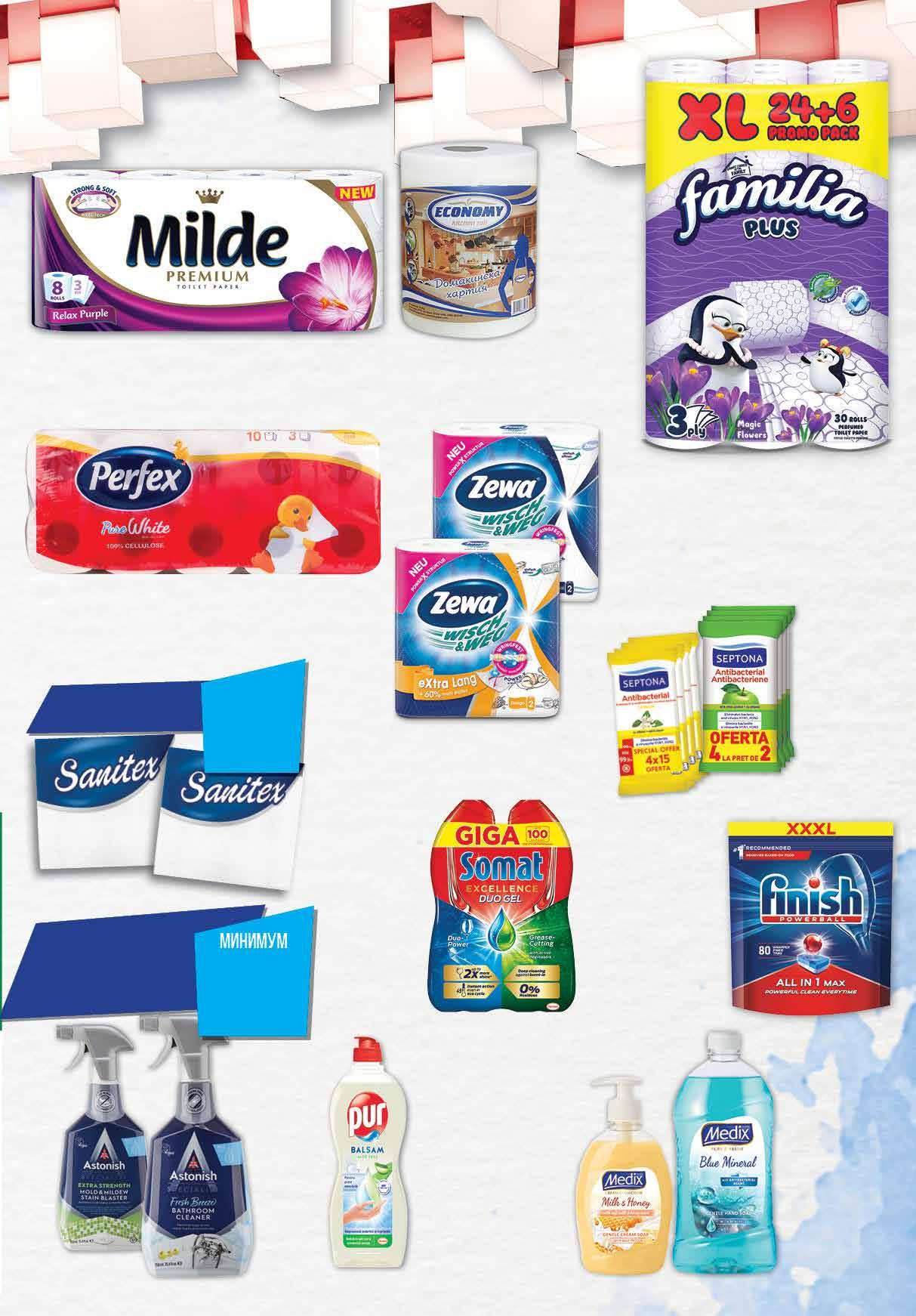 99 лв|бр 47.49 -45% 25 1.99 -20% 1 59 лв|бр 3.05 -26% 2 25 лв|бр 39.99 -40% 23 99 лв|бр 8.79 -31% 5 99 лв|бр design 2.89 -31% 1 99 лв|к-т ябълка 2.89 -31% 1 99 лв|к-т лимон 9.75 -28% 6 99 лв|бр original 6.48 -38% 3 99 лв|бр 7 19 лв|бр 99 лв|бр 20.99 -23% 15 2 29 лв|бр пълнител 2 29 лв|бр помпа Кухненско руло ECONOMY двупластово 1 бр Течен сапун MEDIX помпа, 400 мл; пълнител, 800 мл различни видовеПрепарат за съдове PUR различни видове 450 мл Тоалетна хартия FAMILIA Magic Flowers; White трипластова 24+6 бр пакет Тоалетна хартия PERFEX Pure White; лайка; праскова 10 бр пакет, трипластова Тоалетна хартия MILDE 8 бр в пакет трипластовa различни видове Всички почистващи препарати с марка ASTONISH с Таблетки за съдомиялна машина 65, 72 бр; Комплект гел 2 бр х 900 мл SOMAT *акцията е валидна за магазините със зелени цени отстъпка -25% Кухненско руло ZEWA Wisch And Weg Original - 2 бр в опаковка; Design – 2 бр в опаковка Комплект влажни кърпички SEPTONA ябълка; лимон 4 оп. х 14 броя в опаковка Таблетки за съдомиялна машина FINISH All in1 Max 80 бр; Quantum 60 бр; Quantum Ultimate 50 бр различни видове Купи салфетки с марка SANITEX с отстъпка Минимум -20% 23ТВ „Фантастико” не носи отговорност за допуснати печатни грешки. Количествата са лимитирани! Предложенията са валидни до сряда 22.00ч. на 05.10.2022 г.