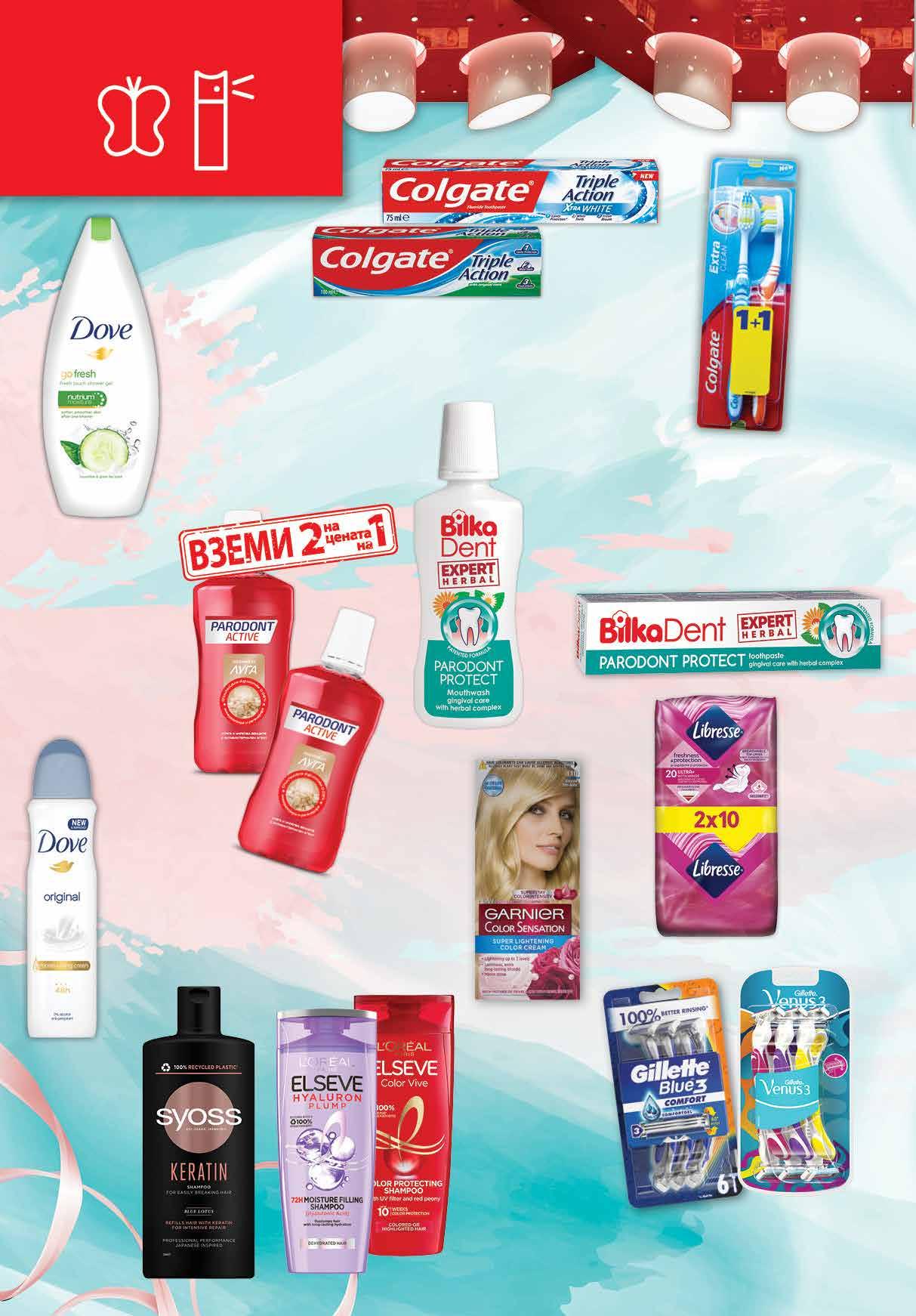1.89 -31% 1 29 лв|к-т 99 лв|бр multicolor11 99 лв|бр11 15.36 -50% 7 68 лв|2бр 5 99 лв|бр 2.79 -43% 1 59 лв|бр 100 мл 2.79 -43% 1 59 лв|бр 75 мл 4 49 лв|бр 11.99 -41% 6 99 лв|бр 9.39 -47% 4 89 лв|бр 6.09 -34% 3 99 лв|бр 5 49 лв|бр 5 89 лв|бр hYaluron; dreamlong 6.59 -19% 5 29 лв|бр 4.69 -25% 3 49 лв|бр Шампоан 250 мл; Балсам 200 мл; ELSEVE различни видове Боя за коса GARNIER Color Sensation различни видове Шампоан; Балсам SYOSS различни видове 440 мл Вода за уста BILKA Dent Parodont Protect; Parodont Protect Herbal 250 мл Паста за зъби BILKA Parodont Protect; Parodont Protect Herbal; Parodont Protect White 75 мл Самобръсначки Gillette Venus Start 3 ножчета; Venus Multicolor 6 бр.; Skinguard 6 бр. Blue 3 6 бр.; Sensor 3 6 бр.; Mach 3 Red Start 3 бр. Паста за зъби COLGATE Whitening 100 мл; защита от кариес 100 мл; прополис 100 мл; Triple action100 мл; Triple action Xtra White 75 мл Дамски превръзки LIBRESSE DUO PACK различни видове 16; 20 бр Део рол-он 50 мл; Стик 40 мл; Спрей 150 мл DOVE различни видове Вода за уста PARODONT поморийска луга 2 бр х 300 мл Комплект четки за зъби COLGATE Extra Clean 2 бр Душ гел 500 мл; Пълнител 720 мл DOVE различни видове 20 Продуктите се продават в количества, обичайни за едно домакинство. Декорацията към продуктите не е включена в тяхната цена. ТВ „Фантастико“ си запазва правото на промяна в цените.