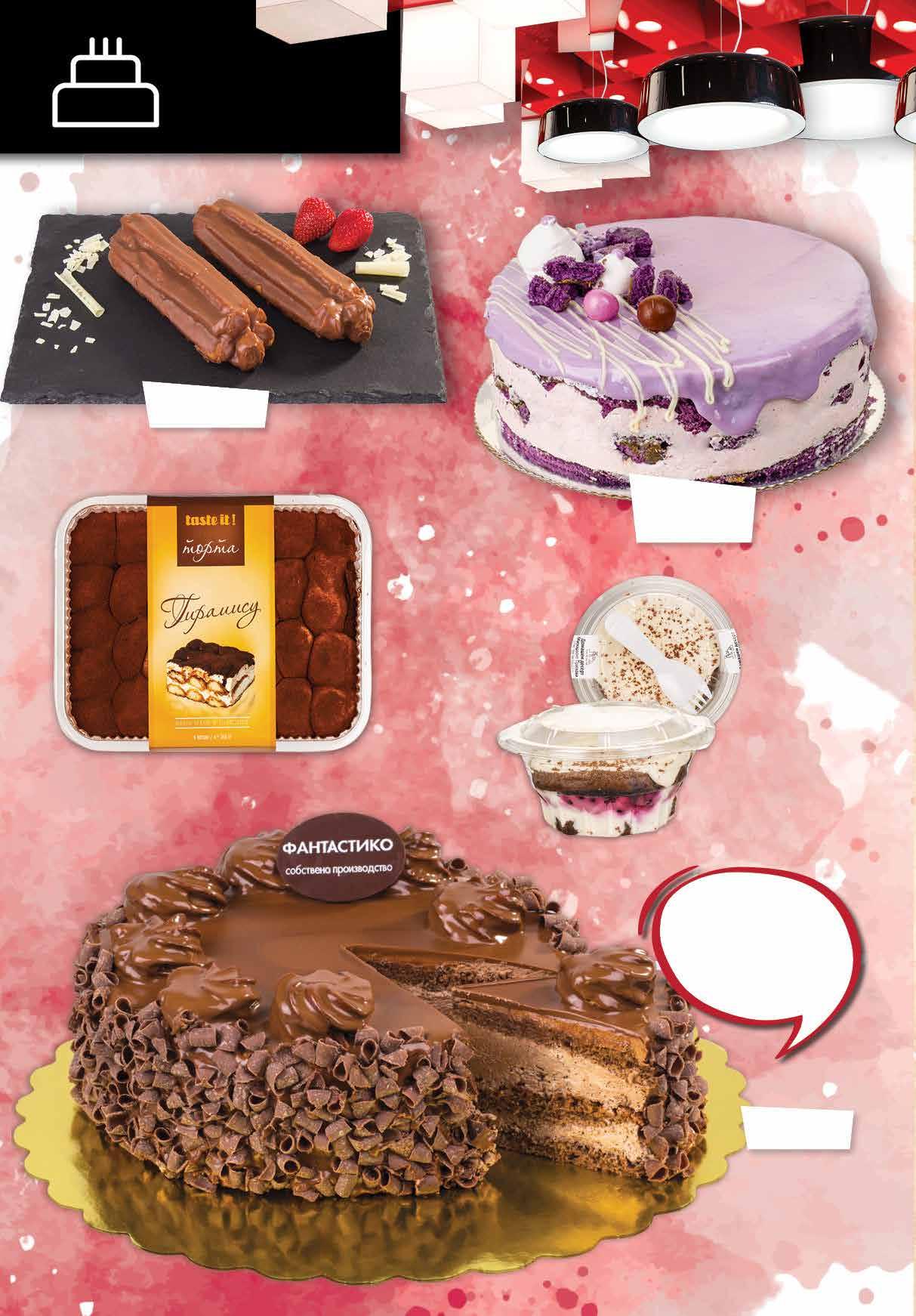 3.99 -30% 2 79 лв|бр 1.99 -25% 1 49 лв|бр 13.99 -28% 9 99 лв|бр 39 лв|бр 19.99 -23% 15 99 лв|бр 24.99 -36% 15 Торта Тирамису TASTE IT 560 г Домашен десерт Маскарпоне ФРЕШ ЛЕНД боровинка; праскова 170 г Еклер с шоколад 100 г Торта Шоко 1 кг Домашно съчетаникакаовиприготвениблатове, с вкусеншоколадов крем идекорирани снежна заливка. Торта Пурпурно кадифе ДВЕТЕ ФУКЛИ 700 г 12 Продуктите се продават в количества, обичайни за едно домакинство. Декорацията към продуктите не е включена в тяхната цена. ТВ „Фантастико“ си запазва правото на промяна в цените.