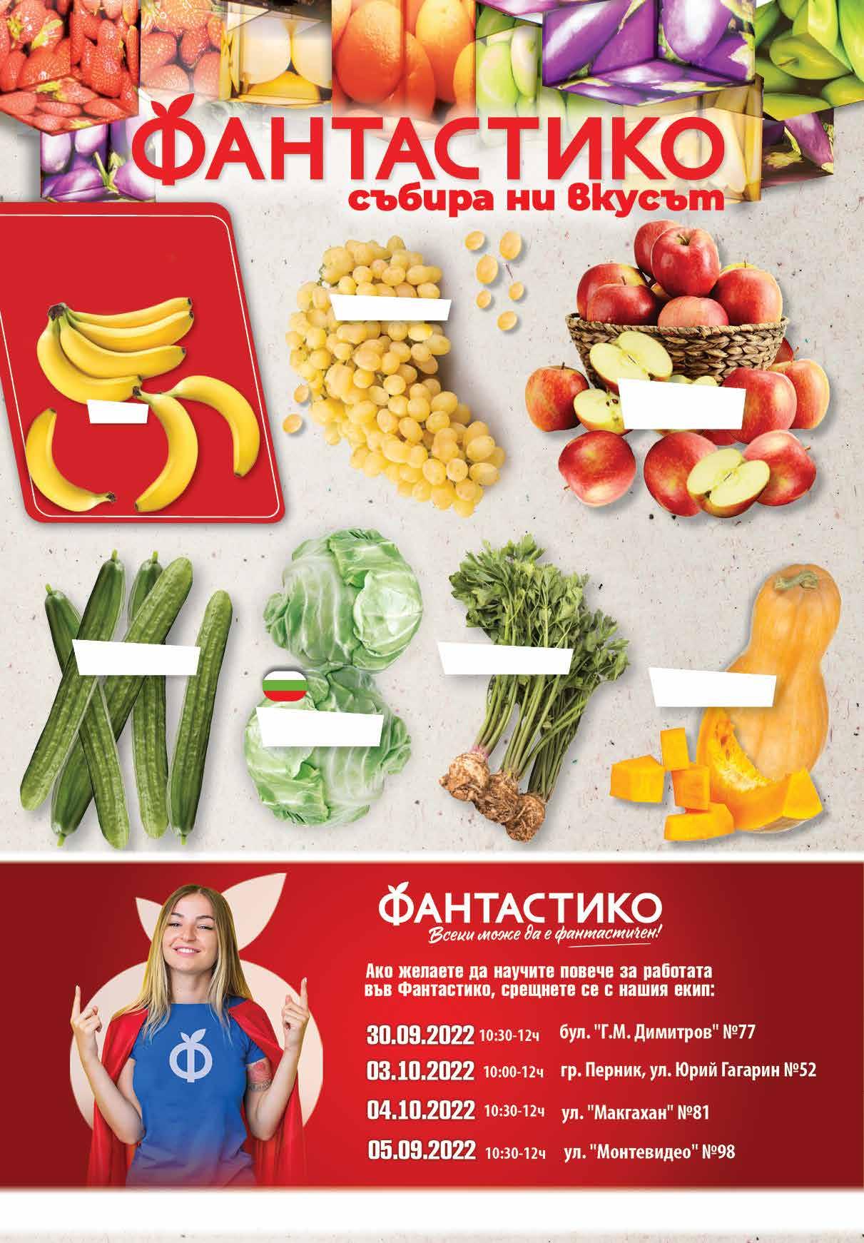 2.79 -28% 1 99 лв|кг 2.99 -33% 1 99 лв|кг 3.79 -21% 2 99 лв|кг 1.99 -25% 1 49 лв|кг 1.19 -33% 0 79 лв|кг 1.19 -42% 0 69 лв|кг 1.99 -35% 1 29 лв|бр Жълта тиква произход България Специалнопредложение запетък,съботаинеделя! Зеле произход България от30.09.до02.10. Червени ябълки произход БългарияБанани Краставици произход България Целина с листа произход България Стафидно грозде Продуктите, обозначени с този символ, са с БЪЛГАРСКИ произход.Снимките са с илюстративна цел. ТВ „Фантастико” не носи отговорност за допуснати печатни грешки. Количествата са лимитирани! Предложенията са валидни до сряда 22.00 ч на 05.10.2022 г.