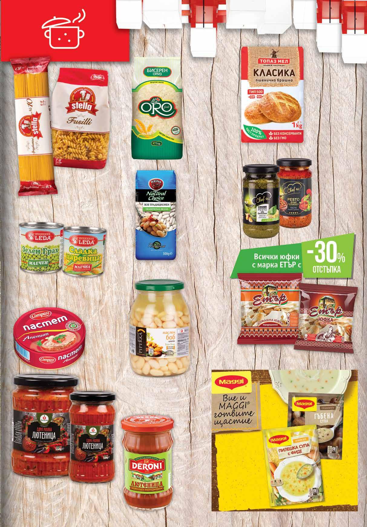 6.69 -25% 4 99 лв|бр 550 г 3.99 -25% 2 99 лв|бр 300 г 2.99 -26% 2 19 лв|бр 3.89 -35% 2 49 лв|бр 4.19 -21% 3 29 лв|бр 1.65 -21% 1 29 лв|бр 4.29 -30% 2 99 лв|бр 6.79 -26% 4 99 лв|бр 2.99 -23% 2 29 лв|бр 2.69 -29% 1 89 лв|бр 2.69 -26% 1 99 лв|бр 1.55 -29% 1 09 лв|бр Супа MAGGI различни видове 40 - 54 г * Супер супа MAGGI не участва в промоцията *Пшенично брашно ТОПАЗ МЕЛ Класика тип 500, 1 кг *ограничение до 10 бр за клиент Боб традиционен KRINA 500 г Едросмляна лютеница; Айвар премиум БУЛГАРПЛОД 550 г; 300 г Пастет COMPASS Апетит 180 г Зелен грах млечен 400 г; Сладка царевица млечна 340 г LEDA Спагети №6; №10; Пене; Фусили; Кус-кус STELLA 500 г Ориз Бисерен My ORO 1 кг Финосмляна лютеница DERONI домашна; пикантна; традиционна 260 г *акцията е валидна за магазините със сини цени Маслен боб салатен PIPERKA 1 кг Песто CHEF IS... различни видове 190 г 9ТВ „Фантастико” не носи отговорност за допуснати печатни грешки. Количествата са лимитирани! Предложенията са валидни до сряда 22.00ч. на 05.10.2022 г.