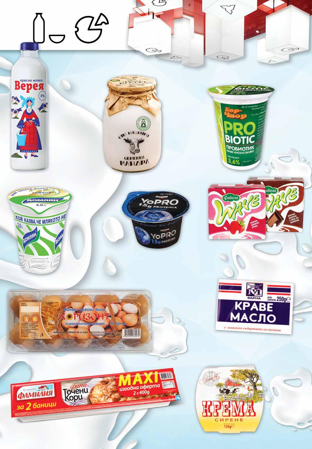 5.79 -32% 3 89 лв|бр 2.19 -22% 1 69 лв|бр 4.99 -20% 3 99 лв|бр 6.79 -44% 3 79 лв|бр 2.99 -20% 2 39 лв|бр 5.69 -21% 4 49 лв|бр 1.79 -27% 1 29 лв|бр 1.55 -25% 1 15 лв|бр 2.39 -25% 1 79 лв|бр 2.05 -24% 1 55 лв|брЙогурт YOPRO различни видове 160 г Мляко ФИБЕЛА масленост 1,5% различни видове 500 мл Крема сирене MARKENBUTTER Luxury 130 г Прясно мляко ВЕРЕЯ масленост 3% 1 л Кисело мляко ДОМЛЯН масленост 2% 500 г Краве масло МИЛТЕКС 250 г Кисело мляко МЛЕЧНА ПЛАНЕТА* масленост 3,6% 1 кг *амбалажа може да се върне Кисело мляко БОР ЧВОР Пробиотик масленост 3,6% 400 г Яйца от свободни кокошки ХОРИЗОНТ размер L, 10 бр Точени кори ФАМИЛИЯ Maxi 2 х 400 г 4 Продуктите се продават в количества, обичайни за едно домакинство. Декорацията към продуктите не е включена в тяхната цена. ТВ „Фантастико“ си запазва правото на промяна в цените.