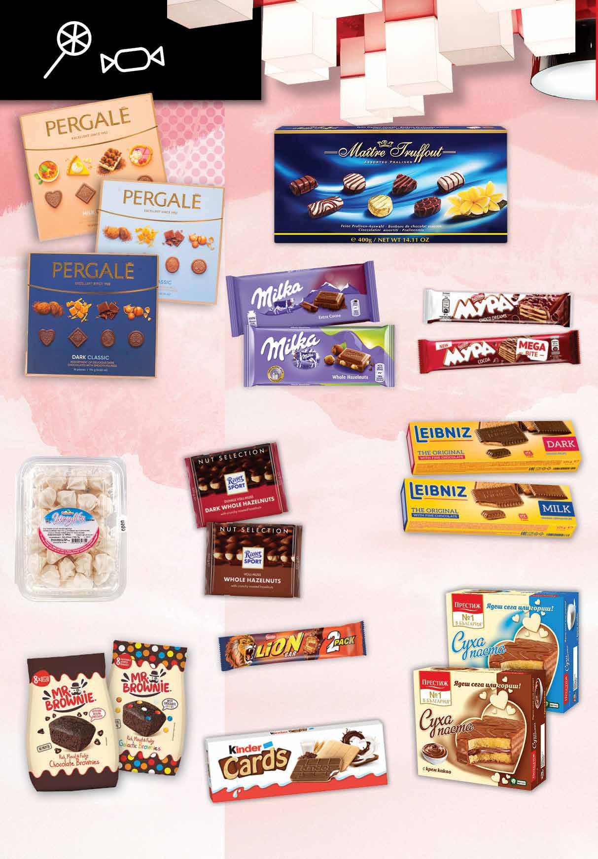 3.19 -37% 1 99 лв|бр 2.79 -28% 1 99 лв|бр 1.29 -31% 0 89 лв|бр 3.99 -25% 2 99 лв|бр 4.59 -34% 2 99 лв|бр 5.29 -24% 3 99 лв|бр 7.99 -27% 5 79 лв|бр 3.79 -29% 2 69 лв|бр 4.59 -21% 3 59 лв|бр 0.79 -30% 0 55 лв|бр 2.99 -13% 2 59 лв|бр Шоколадови бонбони MAITRE TRUFFOUT 400 г Бисквити KINDER Cards 128 г Целувки БЕЛАСИЦА 110 гСнимка Бонбони PERGALE различни видове 113-114 г Бисквити BAHLSEN 100 -125 г; LEIBNIZ KEKS 190г различни видове Десерт LION Bar 2Pack 60 г Шоколад RITTER SPORT 74% какао; бял с цял лешник; тъмен с цял лешник; мечен с цял лешник; млечен с цял бадем 100 г Брауни MR. BROWNIE различни видове 200 г Вафла МУРА различни видове 31-45 г Суха паста ПРЕСТИЖ различни видове 300 г Шоколад MILKA различни видове 90-100 г 14 Продуктите се продават в количества, обичайни за едно домакинство. Декорацията към продуктите не е включена в тяхната цена. ТВ „Фантастико“ си запазва правото на промяна в цените.