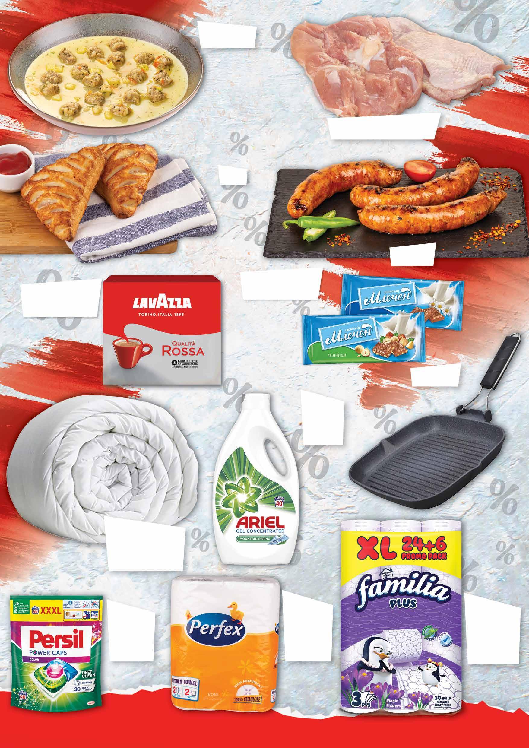 99 лв|бр 13 99 лв|бр 11 99 лв|оп. 16 99 лв|оп. 16 99 лв|бр 150/210 21 11.49 -30% 7 99 лв|кг 0.99 -44% 0 55 лв|бр 1.49 -33% 0 99 лв|бр 10.99 -54% 4 99 лв|кг 1.99 -50% 0 99 лв|бр 1 59 лв|оп. 99 лв|бр 195/210 27 49 лв|к-т 15.89 -27% 11 Пилешка пържола от бут насипнa от щандова витрина Супа топчета с масло Пица 65 г Кухненско руло PERFEX Boni двупластово 2 бр в опаковка Комплект мляно кафе LAVAZZA Qualita Rossa 2 x 250 г Тиган грил 24х24 см Олекотена завивка LANNA микрофибър, 300 г 150/210 см; 195/210 см Тоалетна хартия FAMILIA Magic Flowers трипластова 24+6 бр в опаковка Капсули за пране PERSIL Power Caps 46 бр в опаковка Гел за пране ARIEL 2,2 л планинска пролет Бабекова наденица Шоколад МЛЕЧЕН различни видове 80 г Предложения за периода от 19.01.2023 г до 22.00 ч на 25.01.2023 г важи само и единствено за супермаркети Фантастико - гр. Перник, гр. Ботевград, гр. Кюстендил и гр. София на бул. “Сливница” №65. Продуктите се продават в количества, обичайни за едно домакинство. Декорацията към продуктите не е включена в тяхната цена. ТВ „Фантастико“си запазва правото на промяна в цените. ТВ „Фантастико” не носи отговорност за допуснати печатни грешки. Количествата са лимитирани!