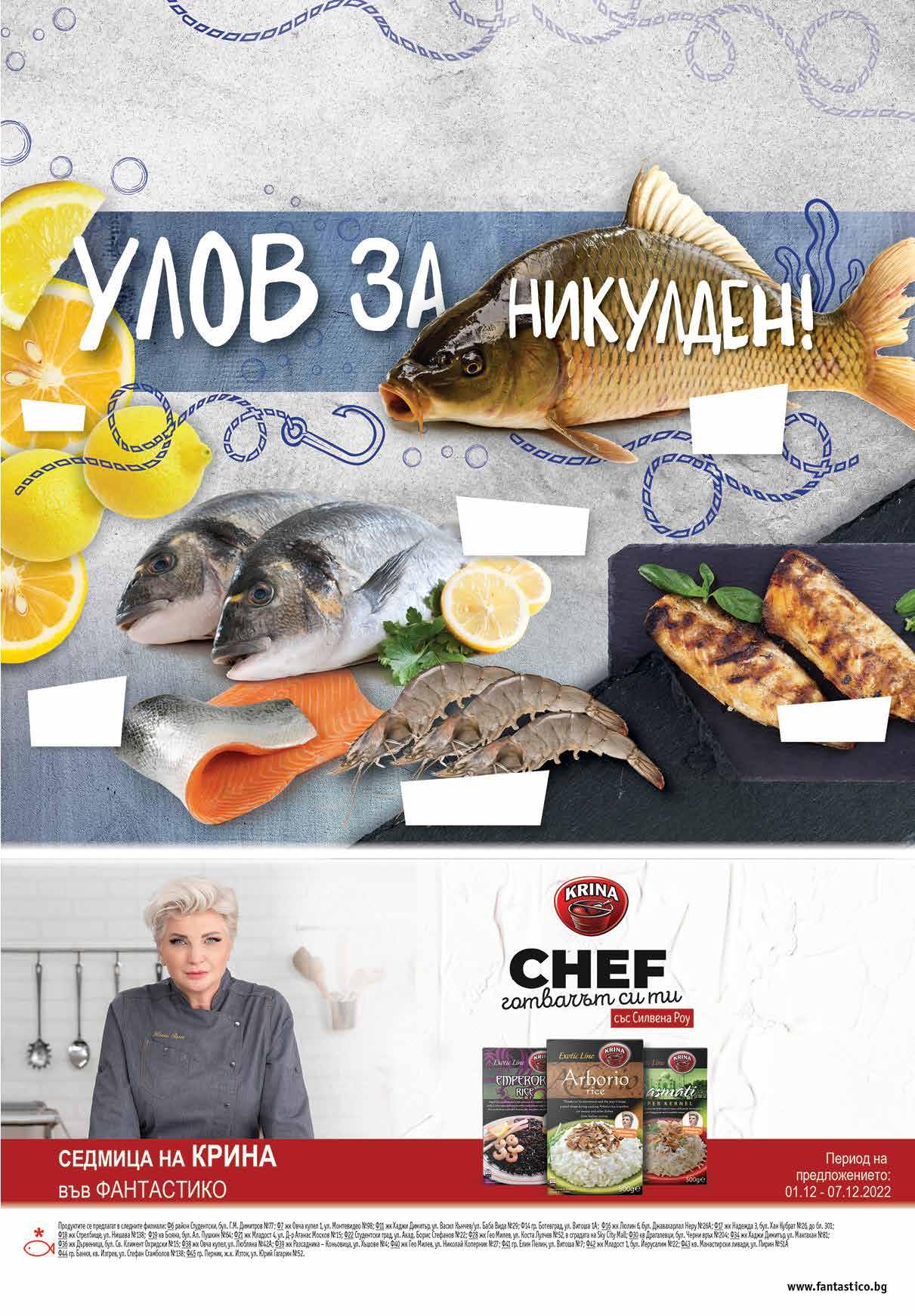 2.99 -33% 1 99 лв|кг 99 лв|кг 20.99 -33% 13 99 лв|кг 43.99 -31% 29 99 лв|кг 29.99 -36% 18 99 лв|кг 23.99 -20% 18 Ципура чистена от щандова витрина* Лимони Сурови скариди размер 40-50 от щандова витрина* Сьомга филе с кожа от щандова витрина* Филе скумрия печено на скара Шаран нечистен от щандова витрина* fantastico.stores www.fantastico.bg ОФЕРТА ЗА ПЕРИОДА от 01 .12.2022 г. до 22.00 ч . на 07.12.2022 г.