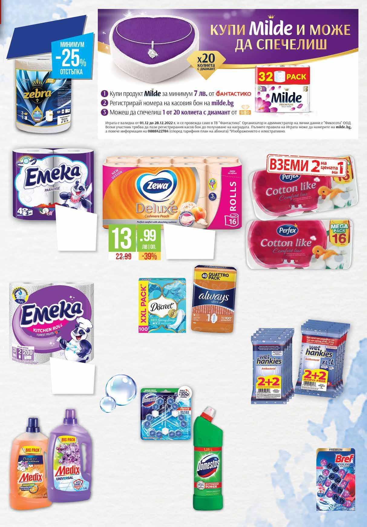 2.99 -23% 2 29 лв|k-t classic 3.79 -26% 2 79 лв|k-t 4.99 -28% 3 59 лв|бр 13.55 -43% 7 69 лв|к-т 59* лв|бр 41.99 -39% 25 4.39 -34% 2 89 лв|бр 3 49 лв|бр 5 69 лв|бр препарат 9.15 -37% 5 69 лв|к-т 58 лв|2 бр 35.16 -50% 17 11.84 -24% 8 99 лв|бр 9.98 -29% 6 99 лв|оп. discreet Тоалетна хартия EMEKA трипластова различни видове 4 бр в пакет Кухненско руло EMEKA бяло; ароматизирано 2 бр в пакет Комплект влажни антибактериални кърпи HANKIES Classic; XL 4 опаковки х 15 бр различни видове Препарат за под MEDIX различни видове 1,4 л Препарат DOMESTOS бор; атлантик 1,25 л; Ароматизатор DOMESTOS WC Power комплект 3 бр х 55 г Комплект ароматизатор за WC BREF Color Aktiv 4 бр х 50 г, различни видове Тоалетна хартия ZEWA Deluxe 16 бр в опаковка, трипластова различни видове * цената е валидна от 1.12 до 07.12.2022г. Тоалетна хартия PERFEX Cotton Like 2 оп. х 16 бр в опаковка Всички кухненски рула с марка ZEBRA с Тоалетна хартия MILDE Premium Relax Purple трипластова, ароматизирана 32 бр в оп. Дамски превръзки ALWAYS Platinum Quattro 22-30 бр пакет; Ultra Quattro 24-40 бр пакет различни видове Дамски превръзки DISCREET ежедневни 100 бр в опаковка 23 ТВ „Фантастико” не носи отговорност за допуснати печатни грешки. Количествата са лимитирани! Предложенията са валидни до сряда 22.00ч. на 07.12.2022 г.