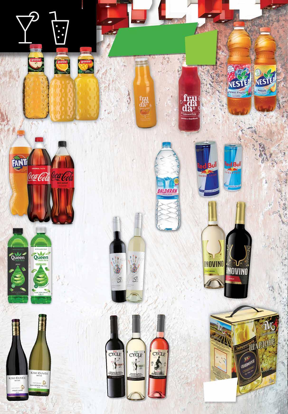 99 лв|бр 15.99 -25% 11 6.99 -28% 4 99 лв|бр 9.69 -27% 6 99 лв|бр 99 лв|бр 15.99 -25% 11 10.99 -30% 7 69 лв|бр 4.29 -39% 2 59 лв|бр 4.69 -36% 2 99 лв|бр сок 2.59 -23% 1 99 лв|бр 3.39 -29% 2 39 лв|бр 2.59 -27% 1 89 лв|бр 4.79 -22% 3 69 лв|бр 0.99 -40% 0 59 лв|бр Вино Совиньон Блан; Пино Ноар KIWI CUVEE произход Франция 750 мл Вино CYCLE различни видове 750 мл Вино Мерло; Шардоне ТЪРГОВИЩЕ bag-in-box 3 л Вино INOVINO различни видове 750 мл Вино CRAFT SMAN‘S Selection различни видове 750 мл Сок/ Нектар GRANINI различни видове 1 л Газирана напитка COCA-COLA; FANTA; SPRITЕ различни видове PET 1,5 л Студен чай NESTEA различни видове 1.5 л Енергийна напитка RED BULL различни видове кен, 250 мл Напитка QUEEN Алое Вера различни видове PET, 1,5 л Изворна вода БАЛДАРАН PET 1,5 л *предложението е валидно за магазините със сини цени Всички смутита и сок с марка FRUDADA 750 мл с отстъпка -30% 16 Продуктите се продават в количества, обичайни за едно домакинство. Декорацията към продуктите не е включена в тяхната цена. ТВ „Фантастико“ си запазва правото на промяна в цените.