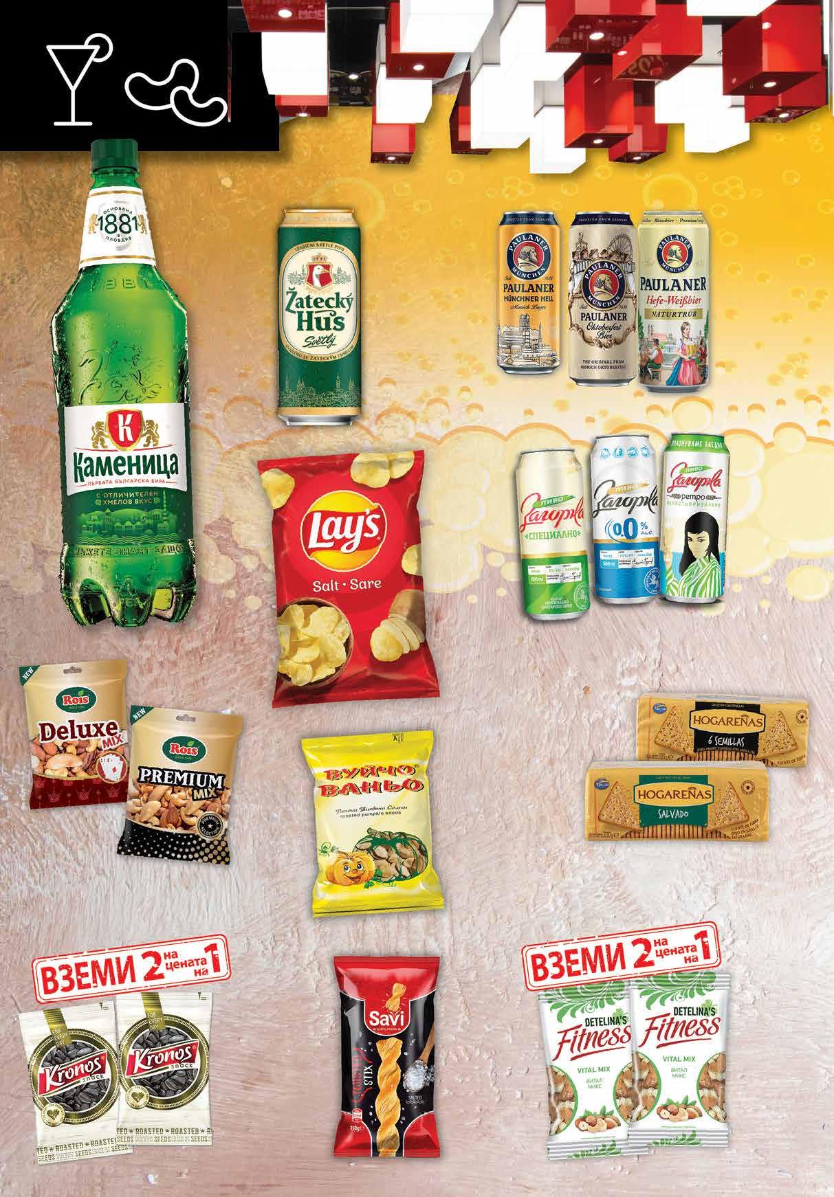 3.59 -36% 2 29 лв|бр 2.79 -21% 2 19 лв|бр 2.29 -21% 1 79 лв|бр 15.96 -50% 7 98 лв|2 бр 2.65 -21% 2 09 лв|бр 7.49 -29% 5 29 лв|бр premium 6.99 -31% 4 79 лв|бр Deluxe 3.88 -50% 1 94 лв|2 бр 2.89 -31% 1 99 лв|бр MUnchner 2.89 -31% 1 99 лв|бр weissbier 2.89 -31% 1 99 лв|бр octoberfest 3.09 -35% 1 99 лв|бр 1.79 -27% 1 29 лв|бр 1.55 -36% 0 99 лв|бр 1.55 -36% 0 99 лв|бр ретро Печени ядки микс ROIS Premium; Deluxe 150 г Соленки SAVI Twisted Stix 150 г Чипс LAYS различни вкусове 200 г Печени тиквени семки ВУЙЧО ВАНЬО 120 г Солени бисквити HOGARENAS различни видове 167-200 г Сурови ядки микс DETELINA Fitness Витал 2 бр х 160 г Слънчоглед КRONOS печен 2 бр х 130 г Бира PAULANER Münchner Hell; Octoberfest; Hefe-Weissbier кен, 500 мл Бира КАМЕНИЦА PET, 2 л Бира ZATECKY HUS светло кен, 500 мл Бира ЗАГОРКА специално; ретро; безалкохолна кен, 500 мл 18 Продуктите се продават в количества, обичайни за едно домакинство. Декорацията към продуктите не е включена в тяхната цена. ТВ „Фантастико“ си запазва правото на промяна в цените.