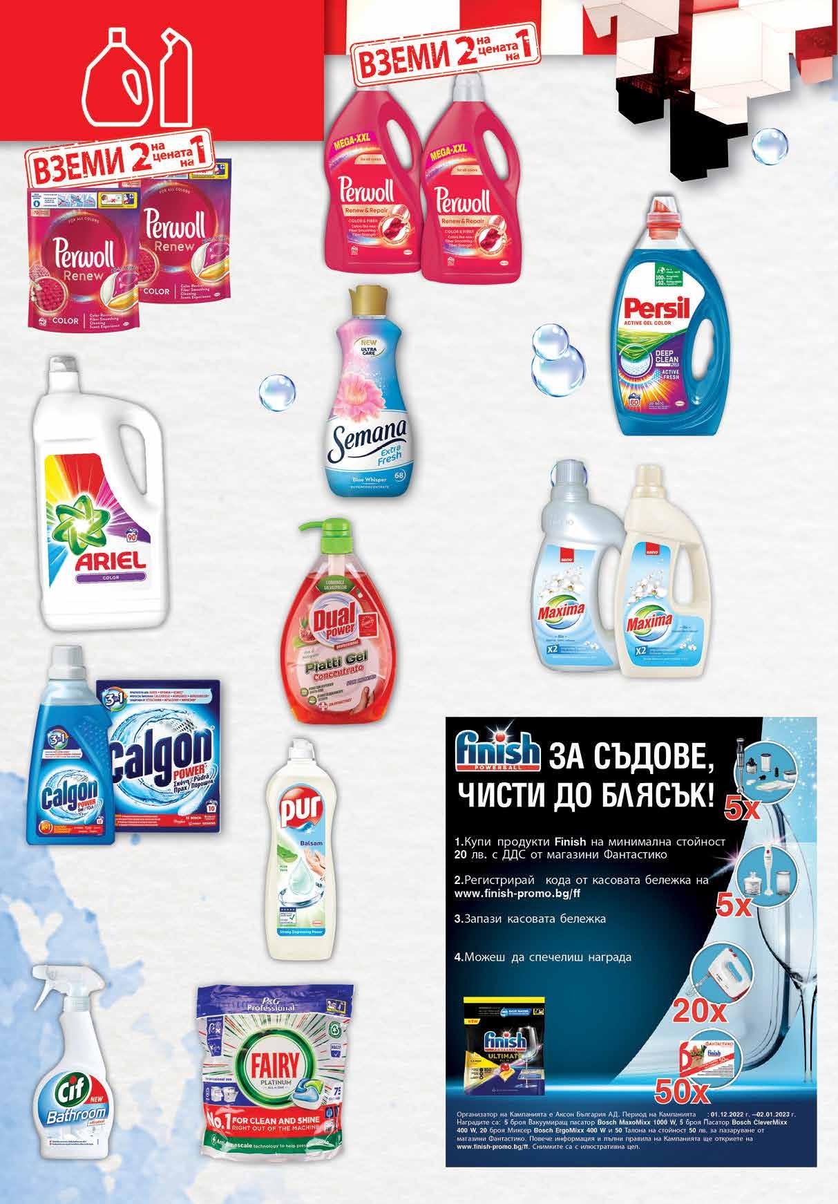 16.99 -41% 9 99 лв|бр гел 10.49 -33% 6 99 лв|бр 5.19 -28% 3 69 лв|бр 2 49 лв|бр 6 29 лв|бр 99* лв|бр 39 99 лв|бр 4 л 15 99 лв|бр 2 л 10 99 лв|oп. 34.99 -42% 19 99 лв|oп. 43.98 -47% 22 99 лв|бр 47.99 -29% 33 98 лв|2 бр 71.96 -50% 35 98 лв|2 оп. 71.96 -50% 35 5.29 -24 % 3 99 лв|бр Препарат за съдове DUAL POWER помпа различни видове 1 л Препарат CIF спрей различни видове 500 мл Омекотител SANO Маxima различни видове 2 л; 4 л Гел против варовик Original 750 мл; Препарат против котлен камък 500 г CALGON Омекотител SEMANA 1.65, 1.70 л; различни видове * цената е валидна от 1.12 до 07.12.2022г. Препарат за съдове PUR 750 мл различни видове Гел различни видове 4.95 л; Капсули Планинска пролет 65 бр; за пране ARIEL Таблетки за съдомиялна машина FINISH Quantum Ultimate 100 бр в опаковка Гел 3 л; Капсули 33 бр/ 40 бр в опаковка; Прах 3.3 кг за пране PERSIL Препарат за пране PERWOLL Renew различни видове 2 бр х 4,05 л Капсули за пране PERWOLL Renew различни видове 2 oп. х 42 бр Таблетки за съдомиялна FAIRY Platinum All in Оne 75 бр в опаковка 22 Продуктите се продават в количества, обичайни за едно домакинство. Декорацията към продуктите не е включена в тяхната цена. ТВ „Фантастико“ си запазва правото на промяна в цените.