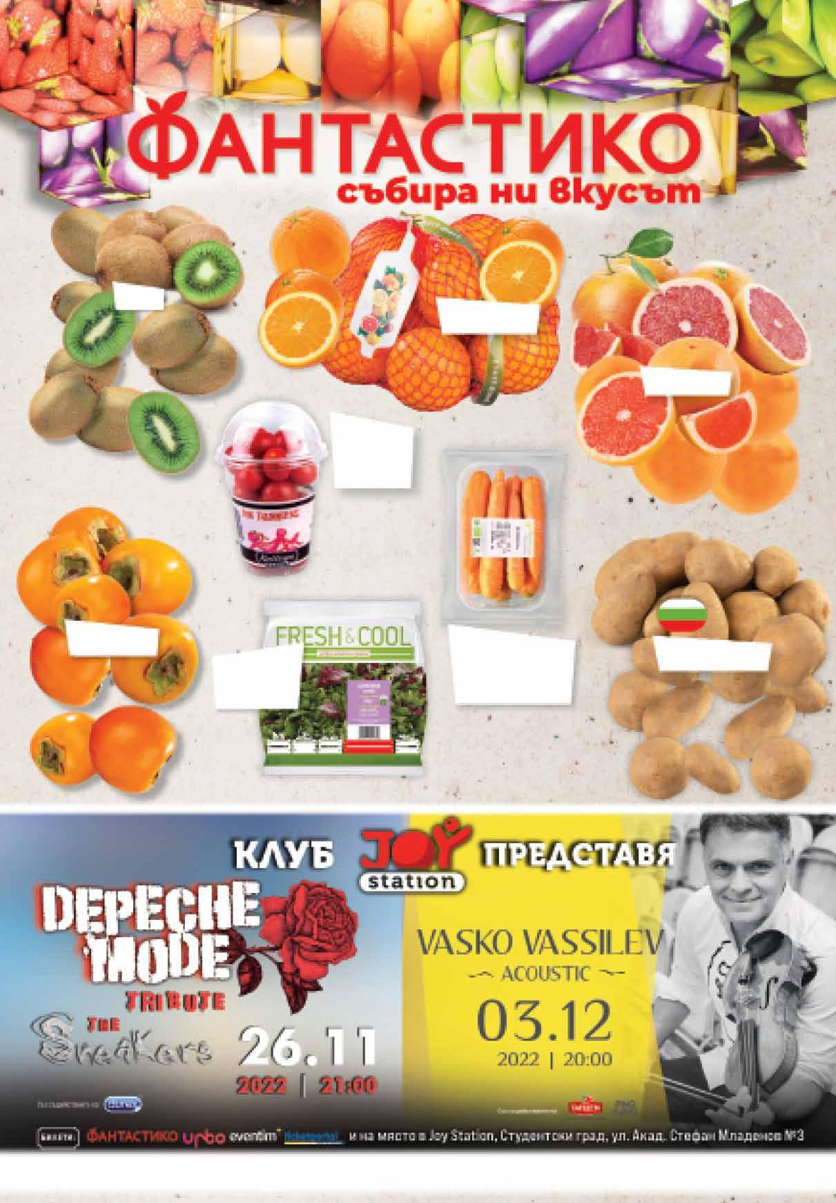 1.49 -33% 0 99 лв|кг 1.99 -20% 1 59 лв|кг 2.99 -33% 1 99 лв|кг 2.79 -32% 1 89 лв|кг 2 69 лв|бр 2.79 -28% 1 99 лв|бр 3.79 -21% 2 99 лв|бр 1.79 -27% 1 29 лв|бр Салата Хармония FRESH & COOL 160 г Картофи четкани произход България Киви Био моркови ФЕРМА МОРАВСКО СЕЛО произход България 500 г Розови чери домати KALLIOPE Pink Panther 250 г Портокали мрежа Грейпфрути Райска ябълка Продуктите, обозначени с този символ, са с БЪЛГАРСКИ произход. Снимките са с илюстративна цел. ТВ „Фантастико” не носи отговорност за допуснати печатни грешки. Количествата са лимитирани! Предложенията са валидни до сряда 22.00 ч на 30.11.2022 г.