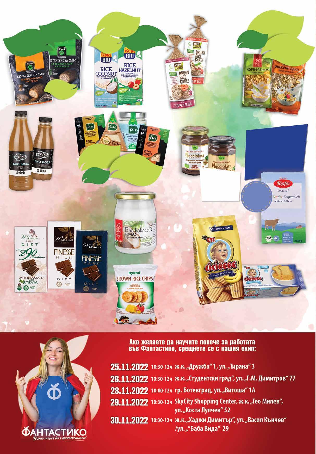 7.99 -20% 6 39 лв|бр 1.69 -23% 1 29 лв|бр 1.69 -29% 1 19 лв|бр 11.99 -37% 7 49 лв|бр 2.39 -20% 1 89 лв|бр 500 мл 3.49 -20% 2 79 лв|бр 1 л 2.29 -21% 1 79 лв|бр сухари 2.19 -18% 1 79 лв|бр бисквити 2.69 -26% 1 99 лв|бр DARK; milk 3.49 -28% 2 49 лв|бр стевия MЛЯКО ТÖPFER КИНДЕР 500 Г 12+, ПРЕХОДНО 600 Г №3, LACTA TODDLER ЗА ДЕЦА 400 Г 1-3 ГОДИНИ* Бебешки бисквити 172 г; Бебешки сухари 125 г CICI BEBE Избрани продукти с марка D‘FREE с отстъпка -20% *акцията е валидна за магазините със сини цени минимум Всички смеси с марка GRAM ЗА КИЛОGRAM с Биологичен лешников и какаов крем NOCCIOLATA различни видове 270 г *акцията е валидна за магазините със зелени цени Мюсли, корнфлейкс и овесени ядки с марка FF ВКУС с отстъпка - 20% *акцията е валидна за магазините със зелени цени Оризови бисквити RICE UP различни видове 120 г Био кокосово масло Ф ВКУС 450 мл отстъпка минимум -20% отстъпка Шоколад MILMEX Finesseориндж dark; диетичен dark; диетичен milk; диабетичен dark с арония 80 г; 277; 290 без глутен със стевия 80 г минимум -11% Оризов чипс B.YOND 60 г различни видове *предложението е валидно за магазините със сини цени Всички напитки с марка ISOLA BIO с *предложението е валидно за магазините със сини цени отстъпка -20% Био боза от ръж ROCKET FOOD 500 мл; 1 л 18 Продуктите се продават в количества, обичайни за едно домакинство. Декорацията към продуктите не е включена в тяхната цена. ТВ „Фантастико“ си запазва правото на промяна в цените.