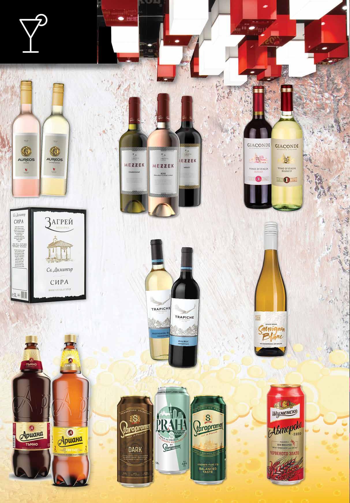 8.49 -29% 5 99 лв|бр бяло; червено 8.49 -29% 5 99 лв|бр розе 2.85 -30% 1 99 лв|бр 3.29 -30% 2 29 лв|бр тъмно 1.69 -29% 1 19 лв|бр 2.09 -33% 1 39 лв|бр 2.09 -33% 1 39 лв|бр praha 2.19 -31% 1 49 лв|бр тъмно 99 лв|бр малбек 16.99 -23% 12 99 лв|бр совиньон 16.99 -23% 12 8.49 -29% 5 99 лв|бр 12.99 -30% 8 99 лв|бр 99 лв|бр 17.99 -27% 12 99 лв|бр 19.99 -25% 14 Бира АРИАНА светло; тъмно PET, 2 л Бира ШУМЕНСКО Червено злато КЕН, 500 мл Бира STAROPRAMEN светло; тъмно; PRAHA КЕН, 500 мл Вино GIACONDI Bianco; Rosso произход Италия 750 мл Вино Совиньон Блан; Малбек TRAPICHE произход Аржентина 750 мл Вино Сира; Мавруд и Димят ЗАГРЕЙ bag-in-box 3 л Вино MEZZEK различни видове 750 мл Вино AUREOS различни видове 750 мл Вино Совиньон Блан MISTY COVE WINES произход Нова Зелендия 750 мл 16 Продуктите се продават в количества, обичайни за едно домакинство. Декорацията към продуктите не е включена в тяхната цена. ТВ „Фантастико“ си запазва правото на промяна в цените.