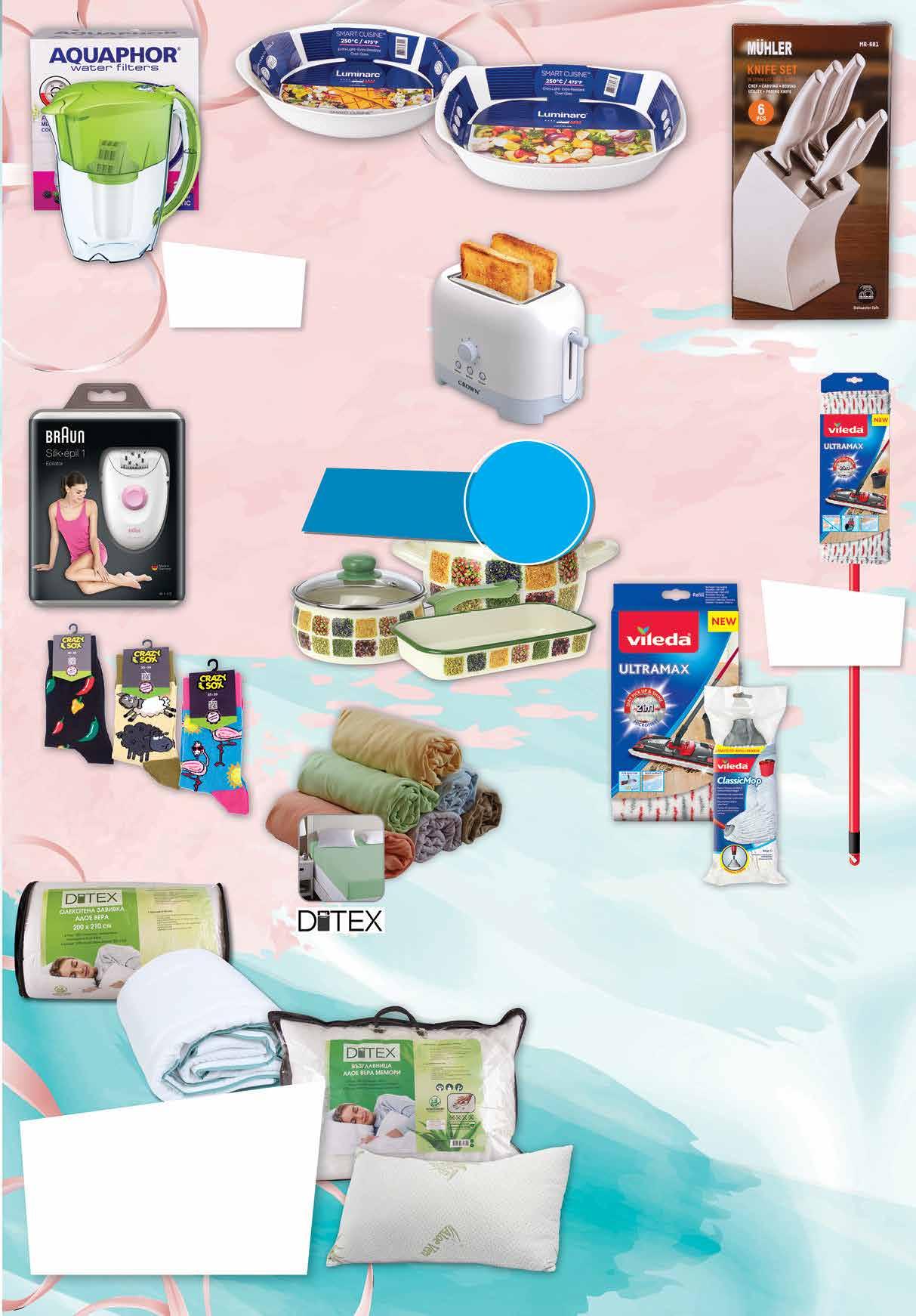 4.95 -21% 3 89 лв|бр бърсалка 99 лв|бР 180х200 18 99 лв|бР 160х200 16 49 лв|бР 100х200 12 99 лв|бр 58.35 -22% 44 99 лв|бр възглавница 17 99 лв|бр 62.99 -30% 43 99 лв|бр 39.99 -50% 19 99 лв|бр 200/210 49.99 -40% 29 99 лв|бр 150/210 39.99 -40% 23 99 лв|бр 24.99 -20% 19 4 49 лв|бр 99 лв|бР 34.99 -25% 25 99 лв|бР 24.99 -40% 14 99 лв|бР 79.99 -40% 47 Филтрираща кана за вода AQUAPHOR Арктик 2,8 л различни цветове Завивка Алое Вера 150/210 см; 200/210 см • Пълнеж: 200 г/м2 • Обшивка – импрегнирана с есенция от Алое Вера. • Хипоалергeнните свойства на екстракта от Алое Вера предпазват от бактерии и микроорганизми. Възглавница Алое Вера Мемори 50/70 см; • Пълнеж: парченца от 100% мемори пяна • Обшивка – импрегнирана с есенция от Алое Вера. • Хипоалергенните свойства на екстракта от Алое Вера предпазват от бактерии и микроорганизми. Moп за почистване на под, резерва Бърсалка VILEDA Ultramax Епилатор BRAUN Eversoft SE1-173 Моп с дръжка VILEDA ULTRAMAX Чорапи височина над глезена CRAZY SOX дамски № 35-39; мъжки № 40-45 различни видове 49 лв|бр 180/200 28.99 -25% 21 99 лв|бр 164/200 26.99 -25% 19 39 лв|бр 90/200 17.99 -25% 13 9.99 -25% 7 49 лв|бр Водонепромокаем протектор за легло тип стелка PNG 90/200см; 164/200см; 180/200см Протектор за възглавница PNG, 50/70 см с цип Тостер CROWN CT-720BW 700W ТАВА LUMINARC SMART CUISINE WAVY 32х20; 34х25 см КОМПЛЕКТ НОЖОВЕ MUHLER 6 части Всички емайлирани съдове за готвене с марка ZACINI с отстъпка -30% *предложението е валидно за магазините със сини цени Чаршаф с ластик за матрак 100/200 см; 160/200см; 180/200 см различни цветове 21 ТВ „Фантастико” не носи отговорност за допуснати печатни грешки. Количествата са лимитирани! Предложенията са валидни до сряда 22.00ч. на 30.11.2022 г.