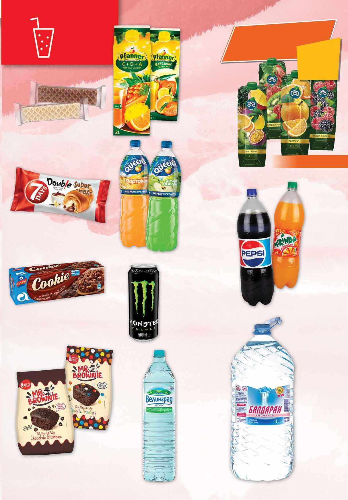 2.69 -37% 1 69 лв|бр 0.79 -25% 0 59 лв|бр 3.39 -26% 2 49 лв|бр 4.69 -22% 3 65 лв|бр 2.49 -20% 1 99 лв|бр 3.99 -30% 2 79 лв|бр 0.99 -30% 0 69 лв|бр 1.49 -33% 0 99* лв|бр 5.99 -25% 4 49 лв|бр C+D+A 5.99 -25% 4 49 лв|бр 3.19 -28% 2 29 лв|бр *предложението е валидно за магазините със зелени цени Плодова напитка мултивитамин C+D+A; мандарина; кайсия PFANNER 2 л Газирана напитка PEPSI/ MIRINDA различни видове 2 л Всички сокове, нектари и плодови напитки с марка BBB oт 1л с Бисквити ALLATINI Cookie различни видове 175 г отстъпка Вафла ХЕЛИ Ретро различни видове 60-65 г Брауни MR. BROWNIE различни видове 200 г -26% минимум Плодова напитка QUEEN‘S различни видове 2 л Изворна вода БАЛДАРАН 11 л *лимитирани количества Енергийна напитка MONSTER различни видове 500 мл Минерална вода ВЕЛИНГРАД PET, 1,5 л Кроасан 7 DAYS какао и ванилия 110 г 15 ТВ „Фантастико” не носи отговорност за допуснати печатни грешки. Количествата са лимитирани! Предложенията са валидни до сряда 22.00ч. на 30.11.2022 г.