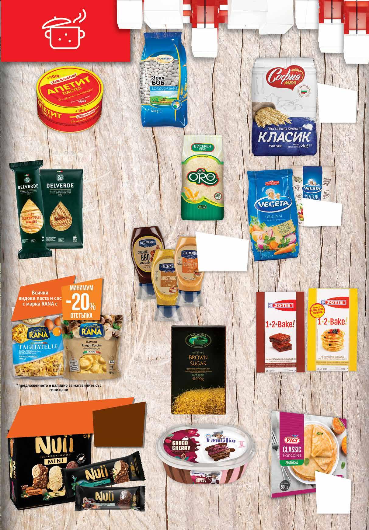 2.99 -36% 1 89 лв|бр 3.39 -26% 2 49 лв|бр 3.69 -27% 2 69 лв|бр 3.29 -18% 2 69 лв|бр 4.59 -28% 3 29 лв|бр 5.49 -31% 3 79 лв|бр 3.19 -31% 2 19 лв|бр палачинки 4.29 -20% 3 39 лв|бр 5.69 -29% 3 99 лв|бр сос 3.49 -34% 2 29 лв|бр 3.29 -30% 2 29 лв|бр 7.99 -30% 5 59 лв|бр Пастет Апетит „ФАМИЛНА+“ 300 г Подправка VEGETA Original 250 г; Natur 150 г Паста DELVERDE спагети №4 ; пене; фусили 200 г, талиатели 250 г Брашно Класик СОФИЯ МЕЛ ТИП 500 2 кг Боб Добруджанка ФАМИЛЕКС 500 г Ориз Бисерен My ORO 1 кг Сос HELLMANN`S Chunky Burger; Барбекю; Горчичен; Лют с чесън и чили 250 мл Всички сладоледи с марка NUII с *предложението е валидно за магазините със сини цени отстъпка -30% Сладолед NESTLE Familia различни видове 345 г Смес JOTIS 1•2•BAKE! различни видове 300-500 г Кафява захар PASSIFLORA нерафинирана 500 г Палачинки VICI замразени, 500 г 9 ТВ „Фантастико” не носи отговорност за допуснати печатни грешки. Количествата са лимитирани! Предложенията са валидни до сряда 22.00ч. на 30.11.2022 г.