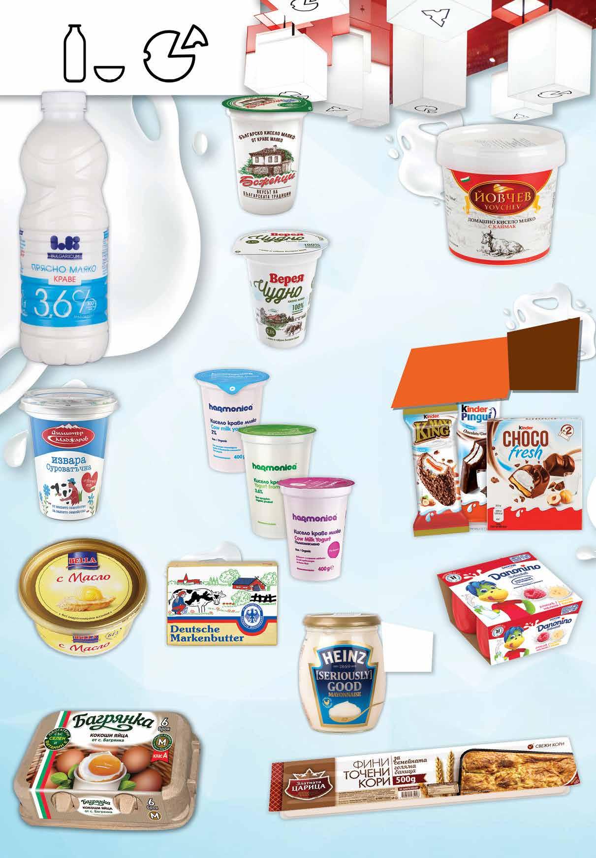 2.95 -18% 2 39 лв|бр десерт 5.99 -23% 4 59 лв|бр 7.99 -31% 5 49 лв|бр 3.99 -25% 2 99 лв|бр 3.99 -25% 2 99 лв|бр 4.79 -31% 3 29 лв|бр 2.39 -22% 1 85 лв|бр 3,6% 1.79 -22% 1 39 лв|бр 2.45 -22% 1 89 лв|бр 2.35 -23% 1 79 лв|бр 2% 6.49 -23% 4 99 лв|бр 3.99 -25% 2 99 лв|бр 1.79 -22% 1 39 лв|бр 3.29 -21% 2 59 лв|бр Фини точени кори 500 г ЗЛАТНАТА ЦАРИЦА Краве масло DEUTSCHE MARKENBUTTER 250 г Био кисело мляко HARMONICA пълномаслено; 3,6%; 2% 400 г Кисело мляко ВЕРЕЯ чудно масленост 2,5% 400 г Кисело мляко ЙОВЧЕВ Домашно с каймак масленост 3,8% 990 г Извара МАДЖАРОВ суроватъчна 350 г Маргарин BELLA с масло 400 г Майонеза HЕINZ Classic 480 г Кисело мляко БОЖЕНЦИ масленост 3,6% по БДС, 400 г Десерт DANONINO 4 бр х 50 г различни видове Яйца БАГРЯНКА със селен размер М 6 бр кутия Всички охладени десерти с марка KINDER с *предложението е валидно за магазините със сини цени отстъпка -20% Прясно мляко ЕЛ БИ масленост 3,6% 1 л 4 Продуктите се продават в количества, обичайни за едно домакинство. Декорацията към продуктите не е включена в тяхната цена. ТВ „Фантастико“ си запазва правото на промяна в цените.