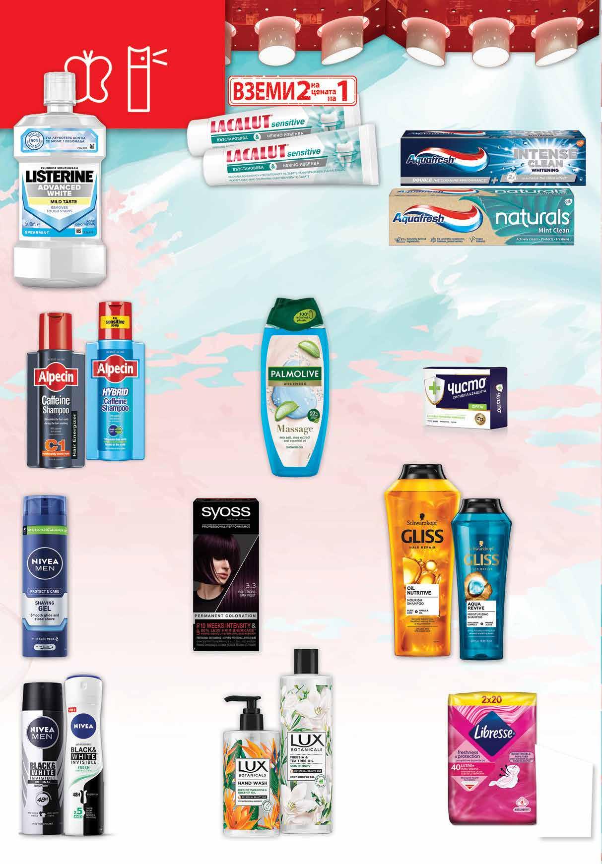 38 лв|2бр 20.76 -50% 10 99 лв|бр HYBRID 14.99 -13% 12 99 лв|бр C1 13.59 -19% 10 2 99 лв|бр 1 39 лв|бр 6 69 лв|бр 6 99 лв|бр 7.99 -42% 4 59 лв|бр 5.39 -25% 3 99 лв|бр сапун 8.89 -32% 5 99 лв|бр душ гел 4 29 лв|бр 10.99 -22% 8 49 лв|бр 10.99 -40% 6 59 лв|бр 5 99 лв|бр 400 мл 4 69 лв|бр 250 мл Део рол-он 50 мл; Део стик 40 мл; Део спрей 150 мл NIVEA различни видове Шампоан 250 мл; 400 мл Балсам 200 мл GLISS различни видове Душ гел 500 мл PALMOLIVE различни видове Боя за коса SYOSS различни видове Сапун ЧИСТО различни видове 100 г Паста за зъби LACALUT White & Repai; White & Sensitive; с ензими; Activ White с ензими 2* бр х 75 мл *от един и същи вид Паста за зъби AQUAFRESH Naturals; Senses; Intense Clean; All In One различни видове 75 мл Течен сапун помпа 400 мл; Душ гел 500 мл LUX различни видове Шампоан ALPECIN C1; Hybrid 250 мл Вода за уста LISTERINE Advanced White; Total Care Zero; Total Care 500 мл Гел за бръснене 200 мл NIVEA различни видове Дамски превръзки LIBRESSE Ultra Wing Long 36 бр; Normal Ultra+ 40 бр 20 Продуктите се продават в количества, обичайни за едно домакинство. Декорацията към продуктите не е включена в тяхната цена. ТВ „Фантастико“ си запазва правото на промяна в цените.