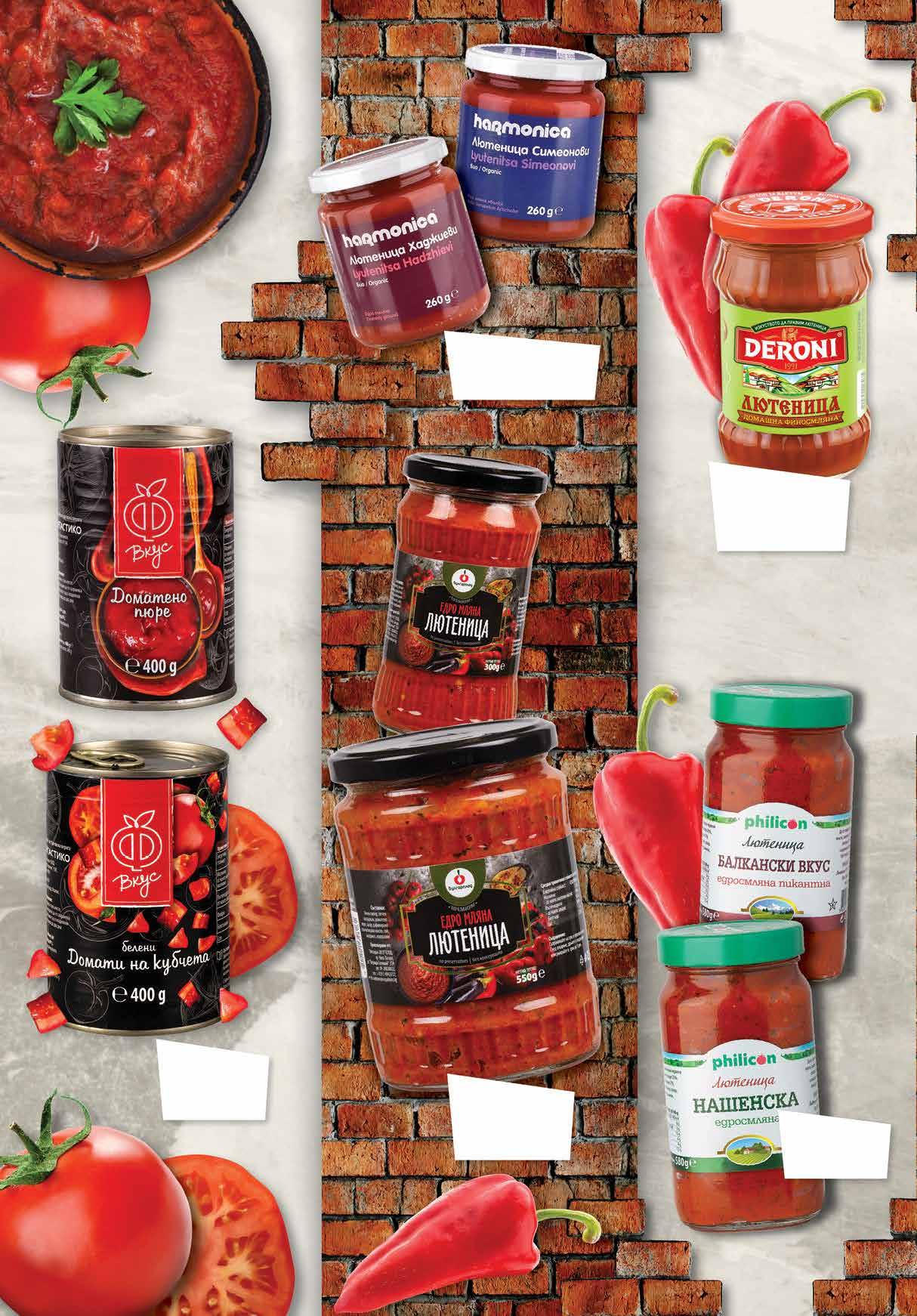 7.69 -27% 5 59 лв|бр 7.99 -20% 6 39 лв|бр 8.99 -20% 7 19 лв|бр хаджиеви 1.69 -23% 1 29 лв|бр 3.99 -30% 2 79 лв|бр 6.99 -28% 4 99 лв|бр 550 г 4.19 -28% 2 99 лв|бр 300 г Лютеница PHILICON Балкански вкус; Нашенска 580 г Био лютеница HARMONICA Хаджиеви; Симеонови 260 г Домати Ф ВКУС белени на кубчета; пюре 400 г Едросмляна лютеница; Айвар премиум БУЛГАРПЛОД 550 г; 300 г Финосмляна лютеница DERONI домашна; пикантна; традиционна 260 г 2 Продуктите се продават в количества, обичайни за едно домакинство. Декорацията към продуктите не е включена в тяхната цена. ТВ „Фантастико“ си запазва правото на промяна в цените.