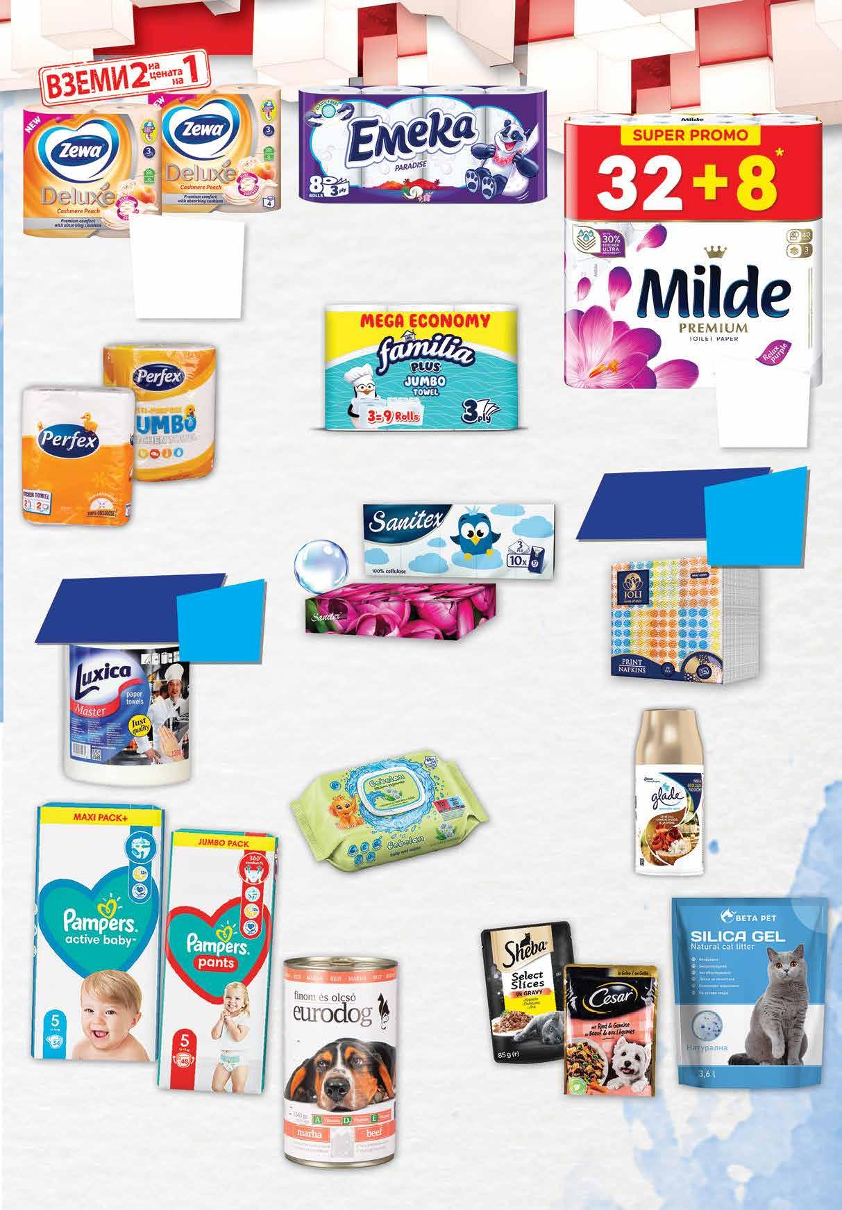 99 лв|бр 28 3.99 -27% 2 89 лв|бр 99 лв|бр 38.99 -28% 27 13.08 -50% 6 54 лв|2 оп. 1.69 -23% 1 29 лв|бр 3.59 -30% 2 49 лв|бр 3.25 -40% 1 95 лв|бр Jumbo 7 99 лв|оп. 12.99 -30% 8 99 лв|бр 2.49 -40% 1 49 лв|оп. Boni 7.79 -35% 4 99 лв|бр 9.99 -30% 6 99 лв|бр 2.35 -19% 1 89 лв|бр носни 2.55 -25% 1 89 лв|бр лице Тоалетна хартия ZEWA ДЕЛУКС различни видове 2 оп.* х 4 бр в опаковка *от един и същи вид Всички Кухненски рула LUXICA с Кухненско руло PERFEX двупластово Jumbo 1 бр; Boni 2 бр в опаковка Кухненско руло FAMILIA JUMBO 3 бр в опаковка Всички салфетки с марка JOLI с отстъпка отстъпка минимум Минимум -25% -25% *предложението е валидно за магазините със зелени цени Пълнител за ароматизатор GLADE Аутоматик различни видове 269 мл Кърпи за лице двупластови 100 бр в кутия Носни кърпи трипластови 10х10 бр в пакет SANITEX различни видове Тоалетна хартия EMEKA трипластова, 8 бр, различни видове Тоалетна хартия Relax Purple; Sensitive 32+8 бр в опаковка Котешка тоалетна BETA PET силикон, натурална 3,6 л Бебешки кърпи BEBELAN различни видове 80 бр с капак Бебешки пелени PAMPERS Maxi Pack 44, 48, 54, 58, 62, 70, 76 бр,различни размери; Бебешки гащички PAMPERS Jumbo Pack 38, 44, 48, 52, 60 бр. различни размери Храна за котки SHEBA 85 г; Храна за куче CESAR 100 г пауч различни видове Храна за куче EURODOG 1.24 кг, консерва различни видове 23 ТВ „Фантастико” не носи отговорност за допуснати печатни грешки. Количествата са лимитирани! Предложенията са валидни до сряда 22.00ч. на 30.11.2022 г.
