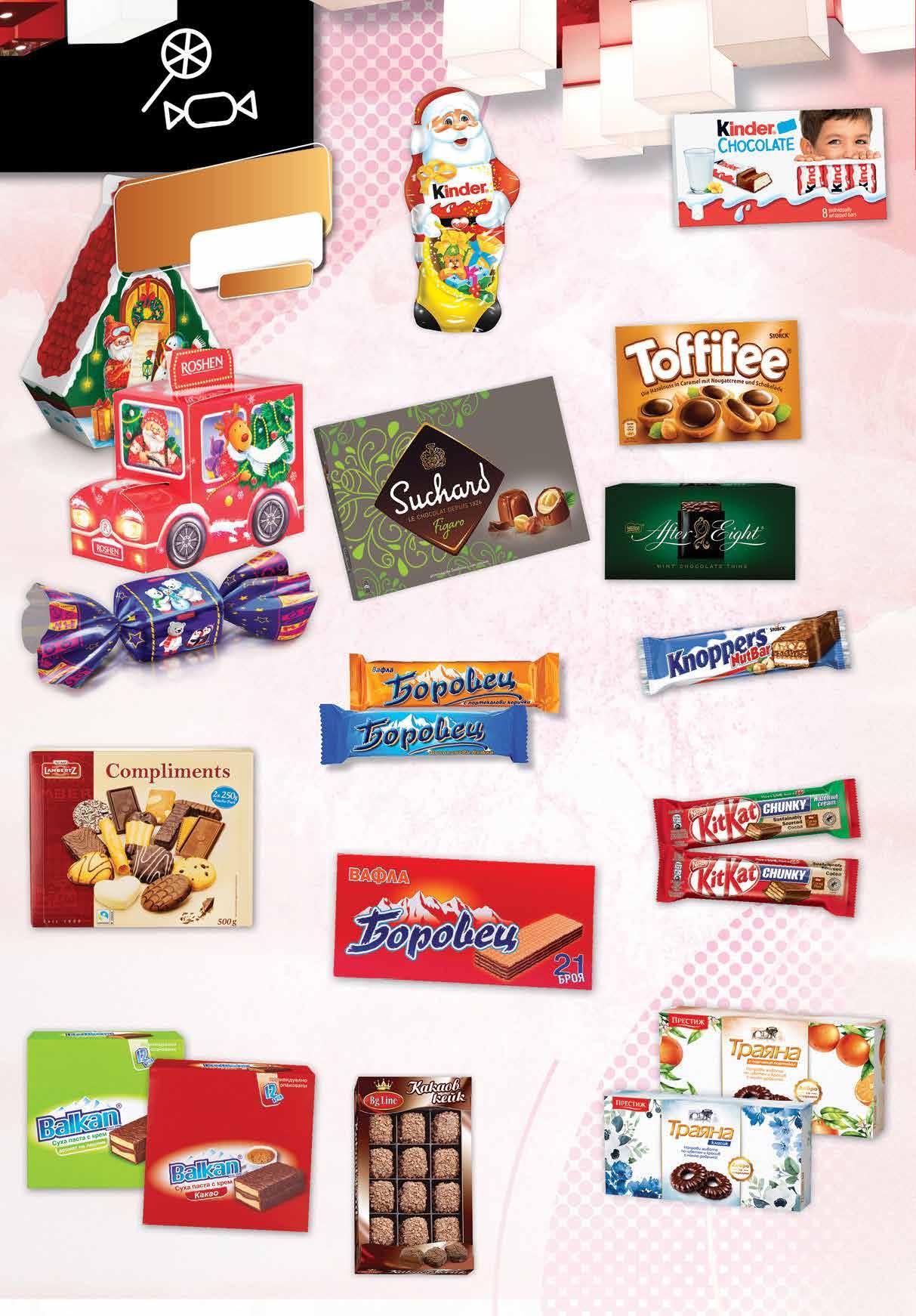 10.99 -36% 6 99 лв|бр 0.69 -28% 0 49 лв|бр 5.99 -28% 4 29 лв|бр 8.99 -30% 6 29 лв|бр 2.89 -25% 2 15 лв|бр 1.59 -37% 0 99 лв|бр 3.99 -25% 2 99* лв|бр 6.39 -43% 3 59 лв|бр 1.15 -34% 0 75 лв|бр 3.99 -25% 2 99 лв|бр 2.79 -28% 1 99 лв|бр 4.69 -29% 3 29 лв|бр 6.59 -39% 3 99 лв|бр Суха паста БАЛКАН различни видове 420 г Бисквити LAMBERTZ Compliments 500 г Тунквани бисквити ТРАЯНА различни видове 160 г Бонбони SUCHARD Aida 252 г; Figaro 306 г Бонбони AFTER EIGHT 200 г Шоколад KINDER 100 г Какаов кейк BG LINE 280 г Вафлa БОРОВЕЦ различни видове 52-55 г Десерт Kit Kat различни видове 42 г *предложението е валидно за магазините със сини цени *лимитирани количества *лимитирани количества Десерт KNOPPERS 40 г Коледни изкушения с марка RОSHEN с -20% отстъпка Вафла БОРОВЕЦ различни видове 550-630 г Бонбони TOFFIFEE 125 г Шоколадова фигура Дядо Коледа KINDER 55 г 14 Продуктите се продават в количества, обичайни за едно домакинство. Декорацията към продуктите не е включена в тяхната цена. ТВ „Фантастико“ си запазва правото на промяна в цените.