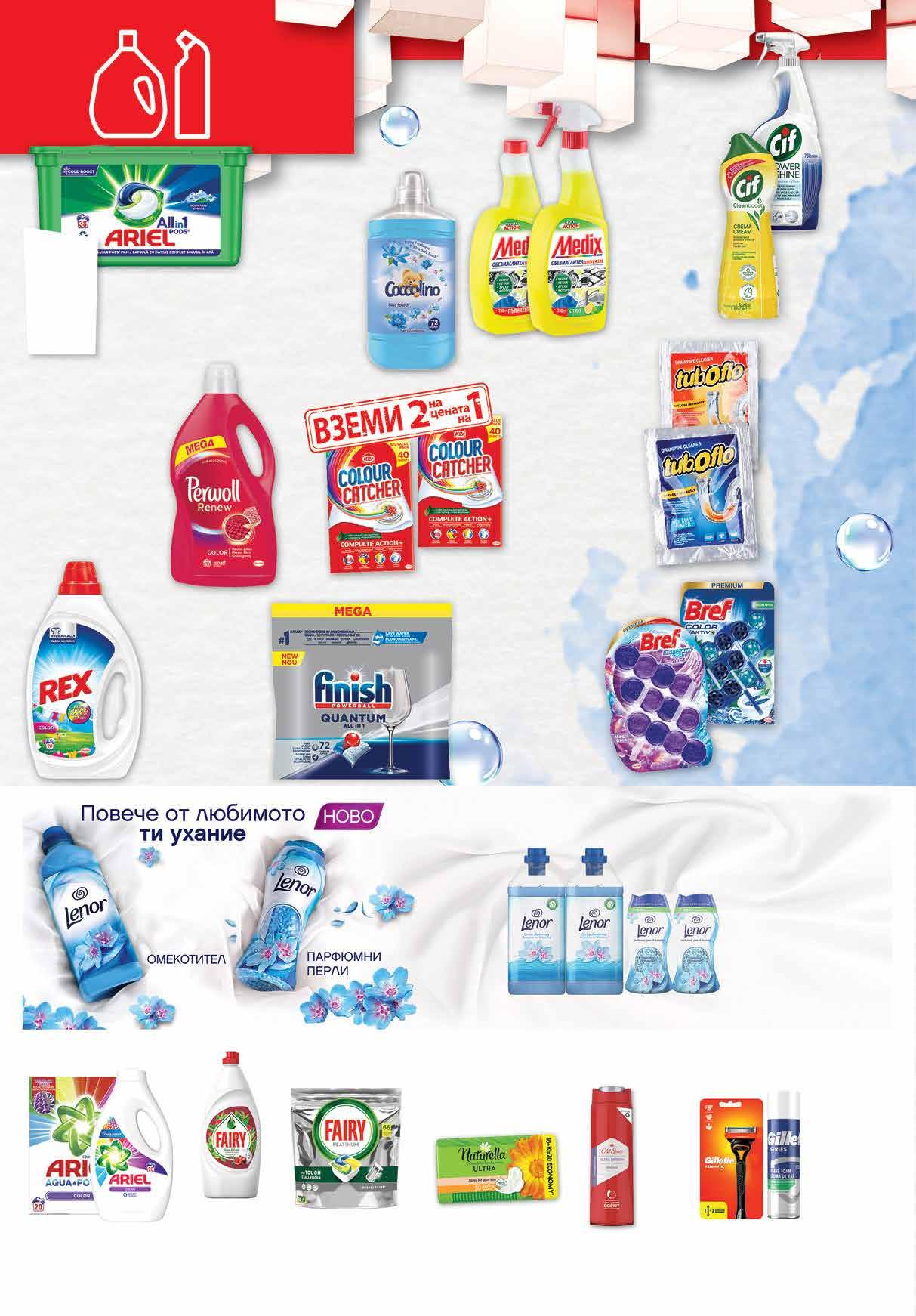 4 89 лв|бр 99 лв|бр 49.99 -50% 24 10.55 -33% 6 99 лв|бр 5.99 -28% 4 29 лв|бр помпа 4.85 -28% 3 49 лв|бр пълнител 6 39 лв|бр 4 99 лв|бр пяна 16.99 -41% 9 99 лв|бр 6.99 -28% 4 99 лв|бр 49 лв|к-т омекотител 11 49 лв|к-т перли 11 99 лв|бр 34.99 -40% 20 10.49 -38% 6 49 лв|бр 0 99 лв|бр 99 лв|бр 31.99 -46% 16 99 лв|бр 44.99 -37% 27 98 лв|2 oп. 25.96 -50% 12 99 лв|к-т 20 4 39 лв|бр 4 39 лв|бр Гел 1 л; Прах 1,1 кг за пране REX различни видове Препарат за съдове FAIRY Classic 800 мл; Еxra 650 мл; Max Power 450 мл различни видове Самобръсначка GILLETTE Fusion, Skinguard с 2 ножчета Пяна за бръснене GILLETTE Series 250 мл Таблетки за съдомиялна машина FINISH All in 1, 100 бр; All in Max, 94 бр; Quantum All in 1, 72 бр; Quantum Ultimate 60 бр Цветоулавящи кърпи COLOR CATCHER за цветно пране 2 оп. х 40 бр в опаковка Обезмаслител MEDIX цветя; цитрус помпа, 750 мл; цитрус пълнител, 750 мл Омекотител 1,68 л; 1,8 л COCCOLINO различни видове Гел 0,8 л; 0,9 л; 1,1 л; Прах 1,3 кг; Капсули 12-14 бр за пране ARIEL различни видове Препарат CIF CREAM различни видове 700 мл CIF POWER за баня 750 мл Комплект омекотител 2 бр х 1.5-1.7 л различни видове Комплект ароматизиращи перли Spring 2 бр x 140 г LENOR Капсули за пране ARIEL Планинска пролет; Color 38 бр в опаковка Душ гел 400 мл OLD SPICE различни видове Таблетки за съдомиялна FAIRY All in one 84 бр в пакет; Platinum Plus 50 бр в пакет; Platinum 66 бр в пакет Препарат различни видове 3.72 л Kaпсули 38 бр за пране PERWOLL Комплект ароматизатор за WC BREF Color Aktiv; Switch Perfume; Deluxе; 3 бр х 50 г Brilliant 3 бр х 42 г различни видове Препарат за отпушване на канали TUB.0.FLO за гореща вода 100 г; за студена вода 60 г Дамски превръзки NATURELLA Duo Pack 14-20 в опаковка различни видове; ежедневни 42 бр в опаковка 22 Продуктите се продават в количества, обичайни за едно домакинство. Декорацията към продуктите не е включена в тяхната цена. ТВ „Фантастико“ си запазва правото на промяна в цените.