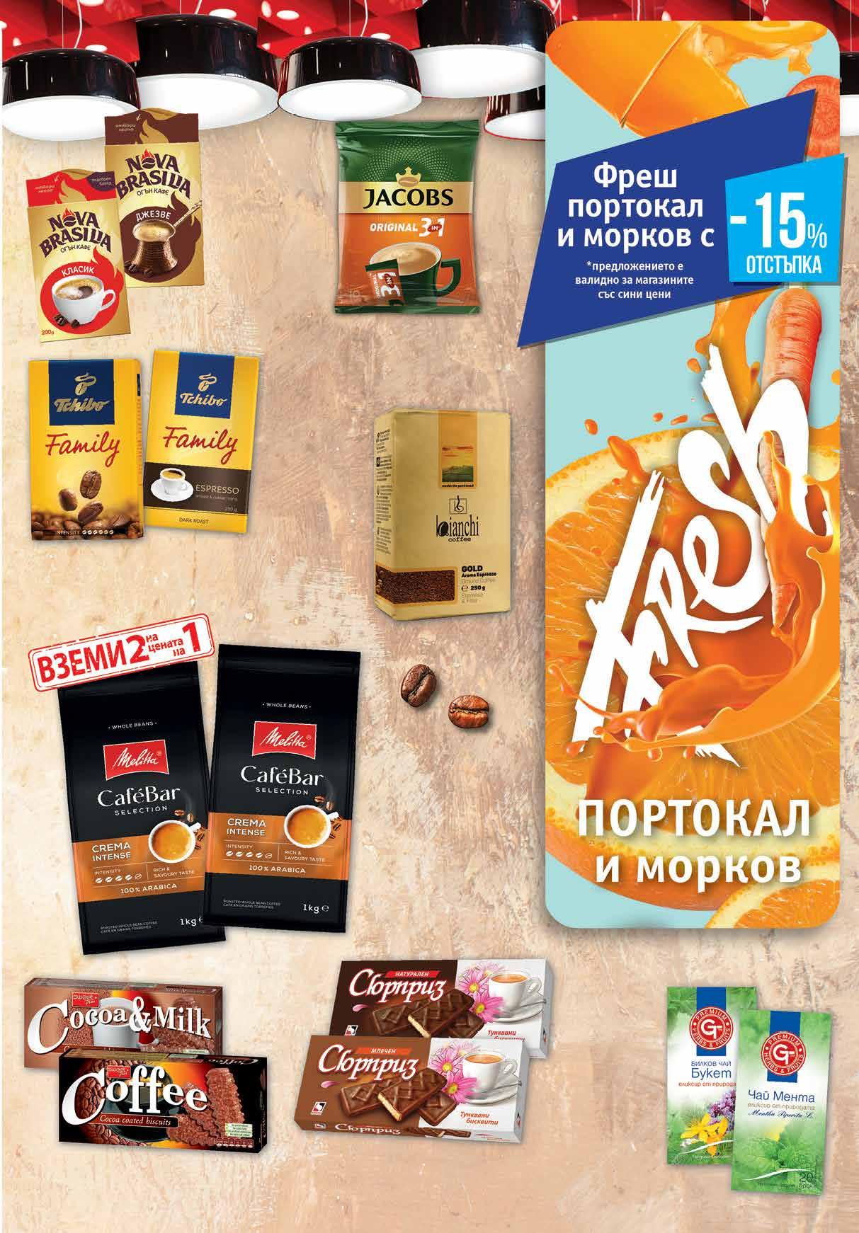 2.99 -33% 1 99 лв|бр 4.19 -35% 2 69 лв|бр 4.29 -30% 2 99 лв|бр 5.89 -39% 3 59 лв|бр 1.75 -26% 1 29 лв|оп. 5.69 -29% 3 99 лв|бр 98 лв|2бр 73.96 -50% 36 2.99 -33% 1 99 лв|бр Мляно кафе NOVA BRASILIA различни видове 200 г Тунквани бисквити СЮРПРИЗ различни видове 160 г Мляно кафе TCHIBO Family различни видове 250 г Чай GT букет; лайка; мента; свежо утро, 20 бр в опаковка Мляно кафе BIANCHI Gold вакуум, 250 г Кафе на зърна MELITTA Cafe Bar Selection 2 бр х 1 кг Разтворимо кафе JACOBS 3in1 10 бр х 18 г, плик Тунквани бисквити COFFEE/COCOA&MILK 150-160 г 13 ТВ „Фантастико” не носи отговорност за допуснати печатни грешки. Количествата са лимитирани! Предложенията са валидни до сряда 22.00ч. на 30.11.2022 г.