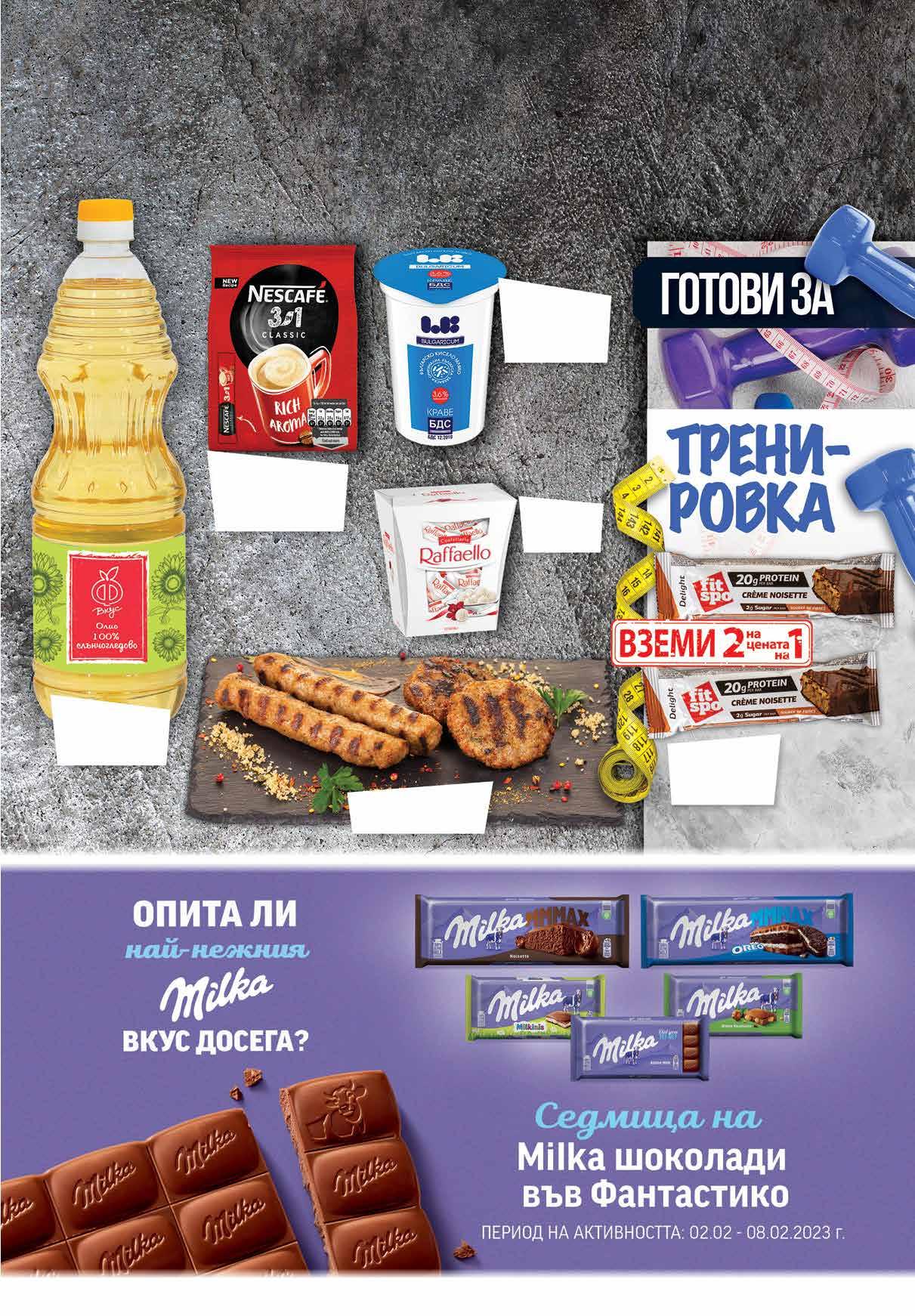9.99 -20% 7 99 лв|бр 1.39 -28% 0 99 лв|бр 1.65 -24% 1 25 лв|бр 4.09 -36% 2 59 лв|бр 3 49 лв|бр 7.36 -50% 3 68 лв|2 бр Протеинов бар FIT SPO крем ноазет 2 бр х 55 г Бонбони RAFFAELLO 230 г Разтворимо кафе NESCAFE 3в1 различни видове, 10 бр х 15-17 г в опаковка Печени кюфтета/кебапчета на скара Кисело мляко ЕЛ БИ масленост 3,6% по БДС 400 г Слънчогледово олио Ф ВКУС 1 л стр.2-3 www.fantastico.bg fantastico.stores ОФЕРТА ЗА ПЕРИОДА от 02 .02.2023 г. до 22.00 ч . на 08.02.2023 г.