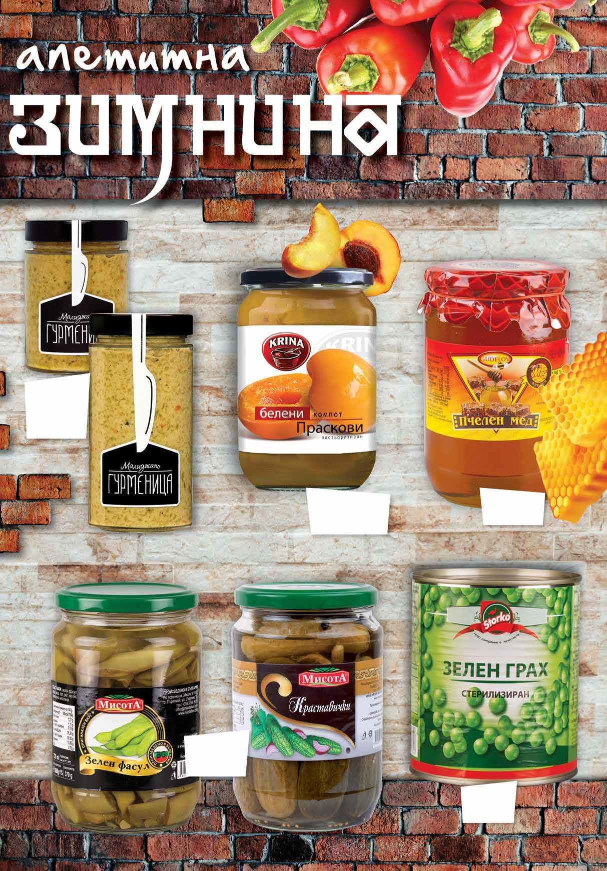 8.99 -22% 6 99 лв|бр 330 г 11.99 -25% 8 99 лв|бр 3.49 -20% 2 79 лв|бр 3.39 -23% 2 59 лв|бр 3.99 -25% 2 99 лв|бр 12.99 -30% 8 99 лв|бр Пчелен мед GUDELOV 900 г Компот от белени праскови KRINA 680 г Зелен фасул; Краставички МИСОТА 720 мл Малиджано ГУРМЕНИЦА класик, пикантнo 330 г; 490 г Зелен грах СТОРКО 820 г 3 ТВ „Фантастико” не носи отговорност за допуснати печатни грешки. Количествата са лимитирани! Предложенията са валидни до сряда 22.00ч. на 18.01.2023 г.