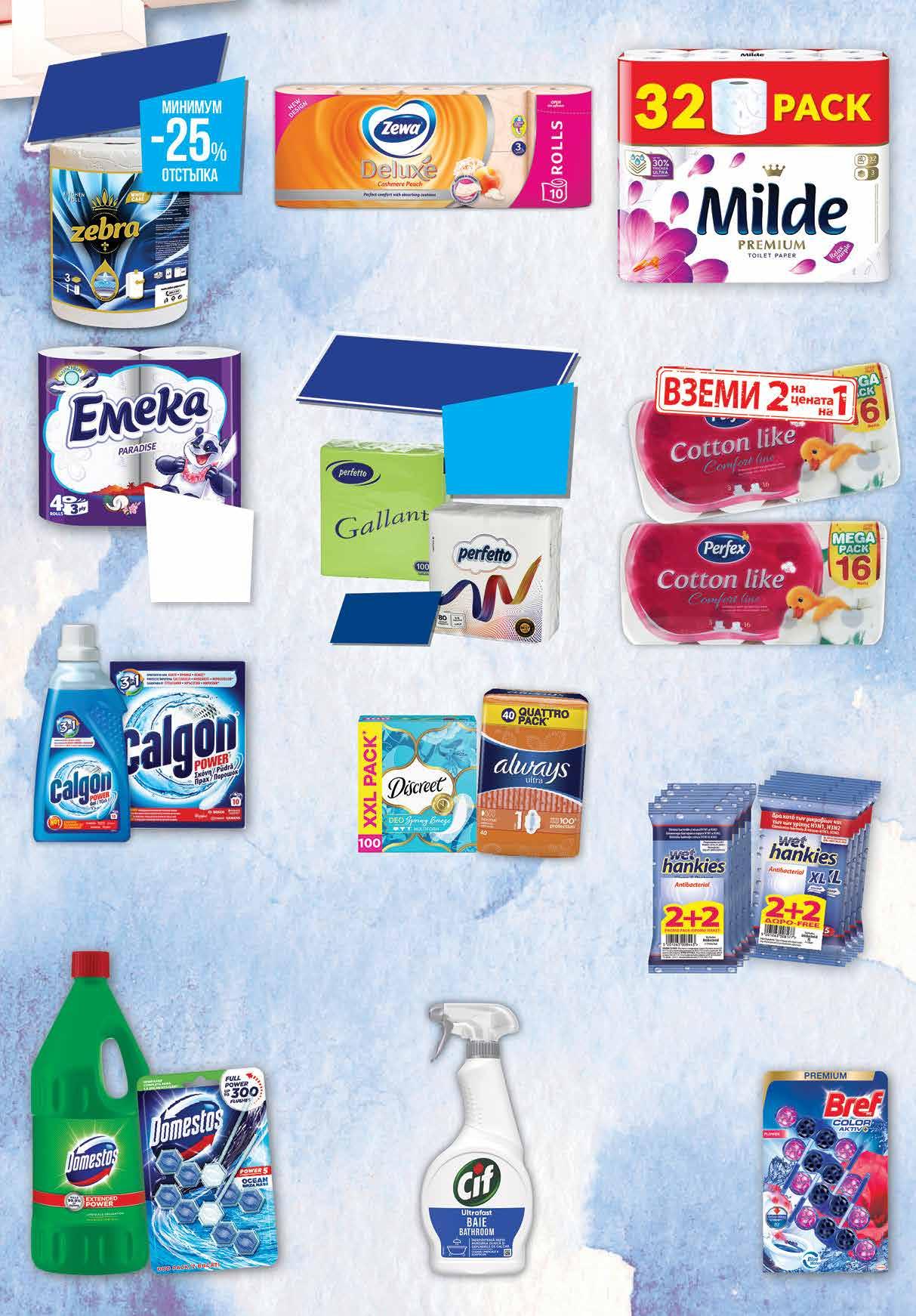 2 29 лв|k-t classic 2 79 лв|k-t 9 99 лв|бр гел 7 49 лв|бр 3 69 лв|бр 7 99 лв|бр 3 79 лв|k-t 58 лв|2 оп. 35.16 -50% 17 99 лв|оп. 23 11.84 -28% 8 49 лв|бр 9.98 -29% 6 99 лв|оп. discreet 2 89 лв|оп. 7 69 лв|к-т 14.98 -33% 9 99 лв|оп. Тоалетна хартия EMEKA трипластова различни видове 4 бр в опаковка Гел против варовик Original 750 мл; Препарат против котлен камък 500 г CALGON Препарат CIF спрей различни видове 500 мл Тоалетна хартия ZEWA Deluxе 10 бр в опаковка трипластова, ароматизирана различни видове Тоалетна хартия PERFEX Cotton Like 2 оп. х 16 бр в опаковка Всички кухненски рула с марка ZEBRA с Комплект влажни антибактериални кърпи HANKIES Classic; XL 4 опаковки х 15 бр различни видове Комплект ароматизатор за WC BREF Color Aktiv 4 бр х 50 г, различни видове Дамски превръзки ALWAYS Platinum Quattro 22-30 бр пакет; Ultra Quattro 24-40 бр пакет различни видове Дамски превръзки DISCREET ежедневни 100 бр в опаковка Тоалетна хартия MILDE Premium Relax Purple трипластова, ароматизирана 32 бр в опаковка отстъпка -20% *акцията е валидна за магазините със зелени цени Всички салфетки с марка PERFETTO с Препарат Атлантик; Бор 2 л Комплект ароматизатор за WC различни видове 2 бр х 55 г DOMESTOS 23 ТВ „Фантастико” не носи отговорност за допуснати печатни грешки. Количествата са лимитирани! Предложенията са валидни до сряда 22.00ч. на 18.01.2023 г.