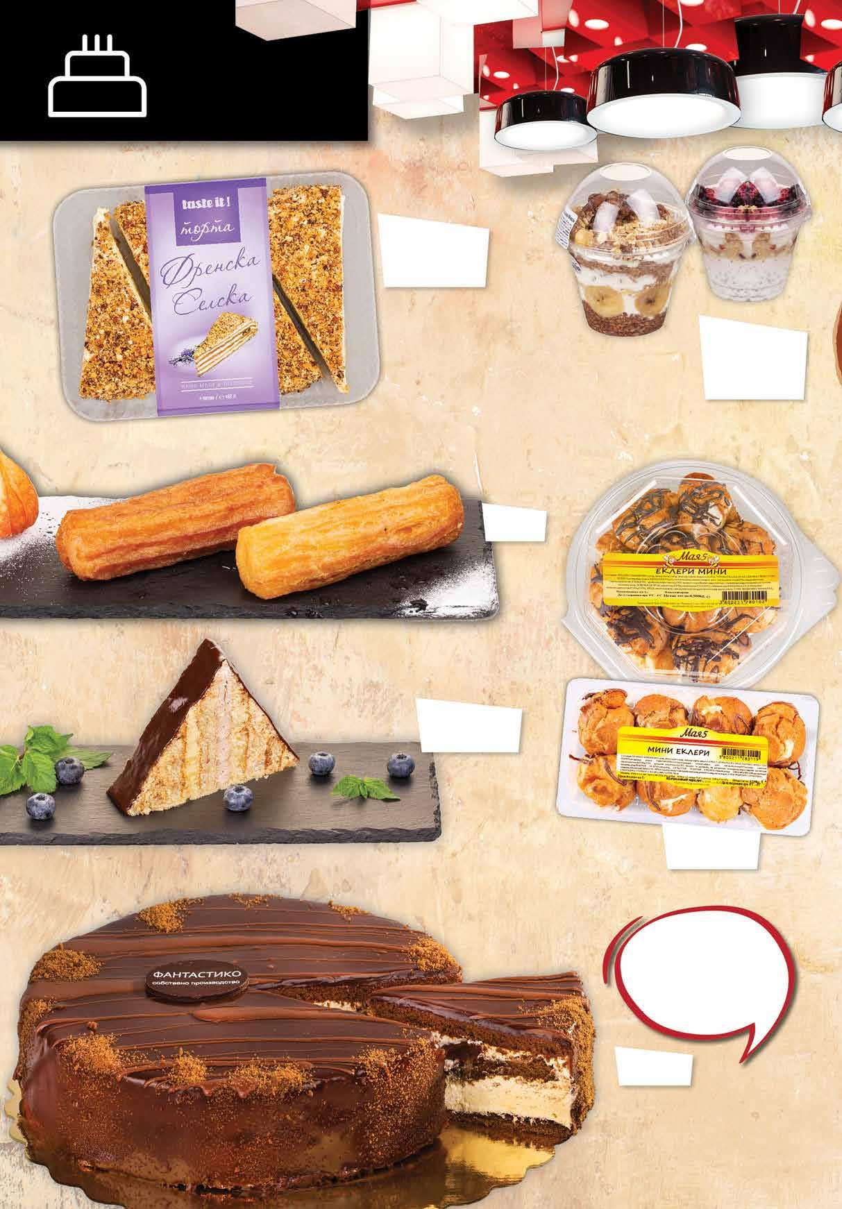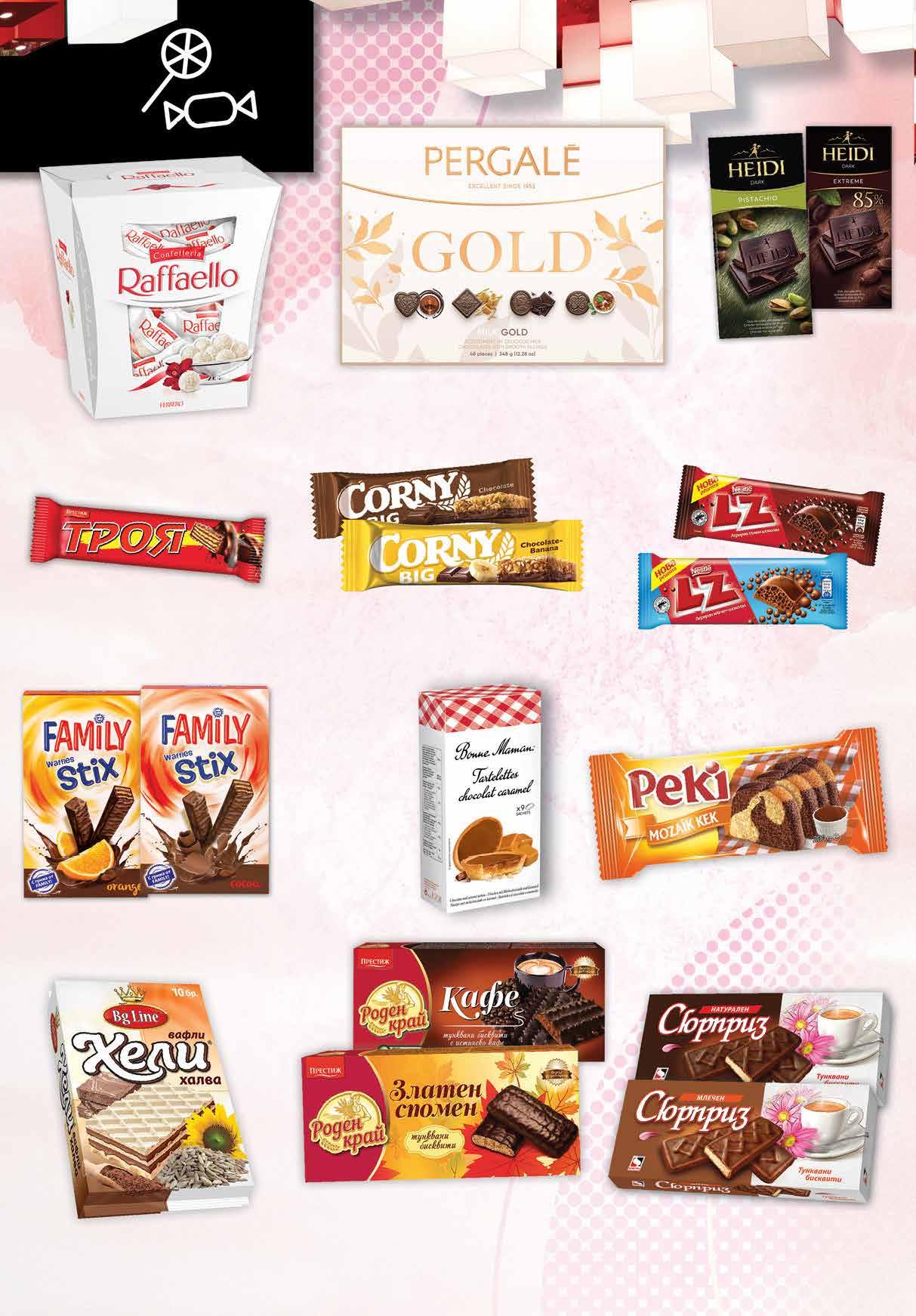 9.99 -25% 7 49 лв|бр 0.49 -34% 0 32 лв|бр 3.99 -25% 2 99 лв|бр 3.99 -50% 1 99 лв|бр 2.99 -33% 1 99 лв|бр 3.19 -25% 2 39 лв|бр 2.45 -26% 1 79 лв|бр 1.09 -27% 0 79 лв|бр 1.65 -27% 1 19 лв|бр 8.99 -33% 5 99 лв|бр 2.09 -23% 1 59 лв|бр 3.39 -38% 2 09 лв|бр Кекс PEKI различни видове 200 г Тунквани бисквити СЮРПРИЗ различни видове 160 г Тунквани бисквити РОДЕН КРАЙ различни видове 135 г Бонбони RAFFAELLO 230 г Вафли FAMILY STIX различни видове 155 г Вафла ТРОЯ 28 г Шоколад HEIDI Dark шам фъстък; какао 85% 80 г Бонбони PERGALE GOLD асорти, 348 г Бисквити BONNE MAMAN TARTALETTES различни видове 125-135 г Шоколад LZ различни видове, 36 г Десерт CORNY различни видове 40-50 г Вафли ХЕЛИ халва 210 г 14 Продуктите се продават в количества, обичайни за едно домакинство. Декорацията към продуктите не е включена в тяхната цена. ТВ „Фантастико“ си запазва правото на промяна в цените.