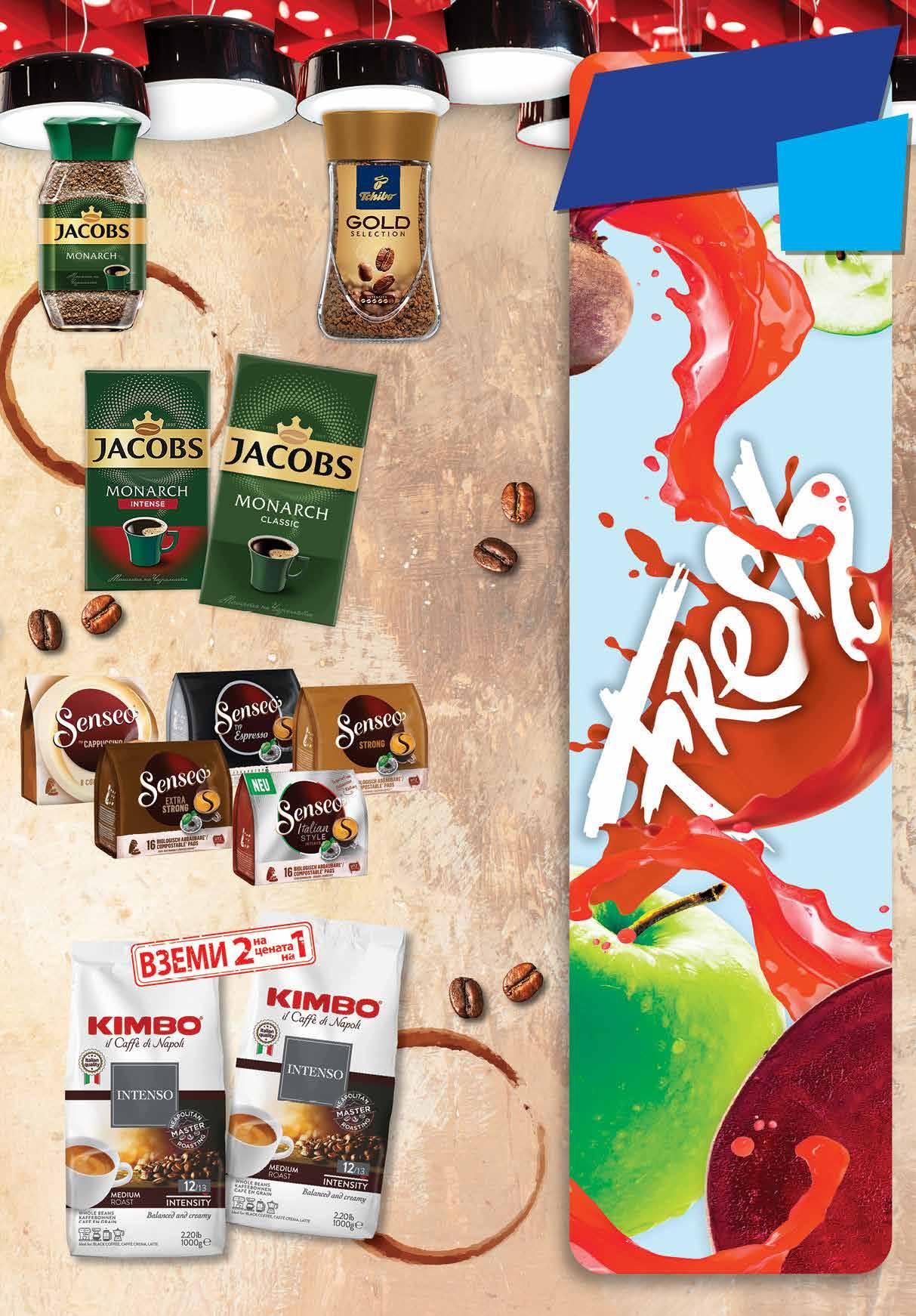 15.59 -42% 8 99 лв|бр 6.99 -24% 5 29 лв|бр 8.89 -37% 5 59 лв|бр 98 лв|2 бр 85.96 -50% 42 10.99 -40% 6 59 лв|бр Мляно кафе JACOBS Monarch Classic; Intense вакуум, 250 г Разтворимо кафе TCHIBO Gold Selection 200 г Капсули кафе SENSEO различни видове 8-16 бр в опаковка Кафе на зърна KIMBO Intenso 2 бр х 1 кг Разтворимо кафе JACOBS Monarch различни видове 100 г ябълка и цвекло Фреш ябълка и цвекло с отстъпка -33% *предложението е валидно за магазините със сини цени 13 ТВ „Фантастико” не носи отговорност за допуснати печатни грешки. Количествата са лимитирани! Предложенията са валидни до сряда 22.00ч. на 18.01.2023 г.