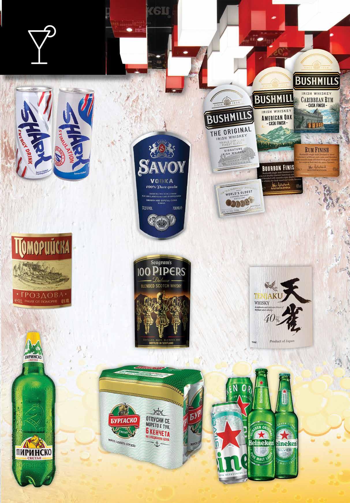 2.99 -26% 2 19 лв|бр 7.49 -21% 5 89 лв|бр 99 лв|бр THE ORIGINAL 31.99 -31% 21 99 лв|бр CASK FINISH 36.99 -29% 25 99 лв|бр 14.49 -24% 10 11.99 -25% 8 99 лв|бр 2.39 -25% 1 79 лв|бр simulation 3.19 -37% 1 99 лв|бр classic 99 лв|бр 49.99 -32% 33 99 лв|бр 19.99 -35% 12 2.19 -22% 1 69 лв|бр 2.19 -22% 1 69 лв|бр Silver, бутилка Бира HEINEKEN Classic; Silver кен, 500 мл; бутилка* 500 мл *с включен амбалаж Бира БУРГАСКО Мултипак кен 6 бр х 500 мл Ирландско уиски BUSHMILLS Тhе Original; Caribbean Rum Cask finish; American Oak Cask finish 700 мл Бира ПИРИНСКО светло ПЕТ, 2 л Японско уиски TENJAKU 700 мл Гроздова ракия ПОМОРИЙСКА 700 мл Водка SAVOY 700 мл Енергийна напитка SHARK различни видове 250 мл Шотландско уиски 100 PIPERS 700 мл 17 ТВ „Фантастико” не носи отговорност за допуснати печатни грешки. Количествата са лимитирани! Предложенията са валидни до сряда 22.00ч. на 18.01.2023 г.